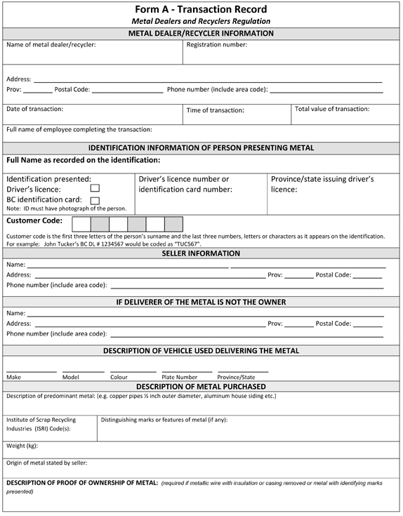 6 (1) A metal dealer or recycler must record transaction information in Form A.