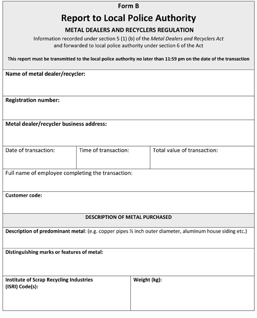 (b) keep a copy of the Form B that is provided to a local police authority, including a hard copy referred to in paragraph (a), on the metal dealer or recycler's business premises for at least one year from the date of the transaction.