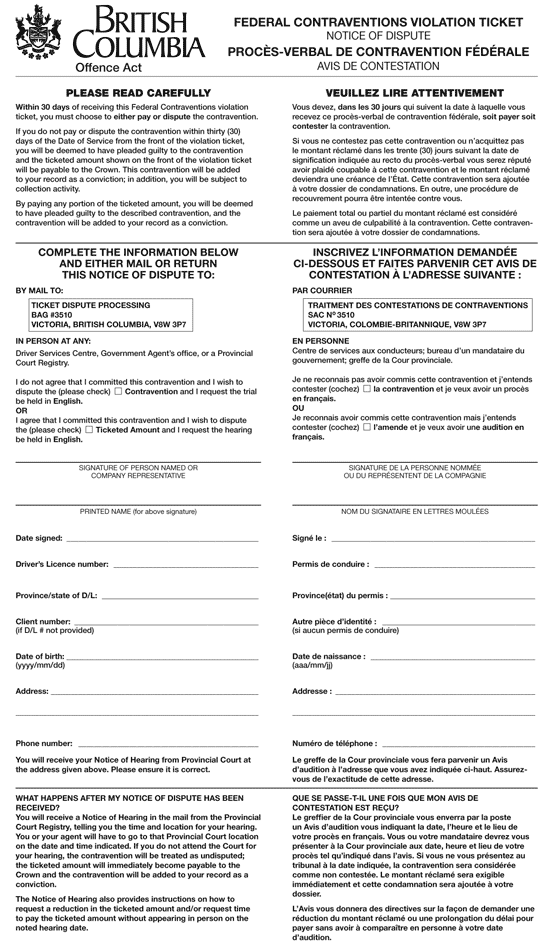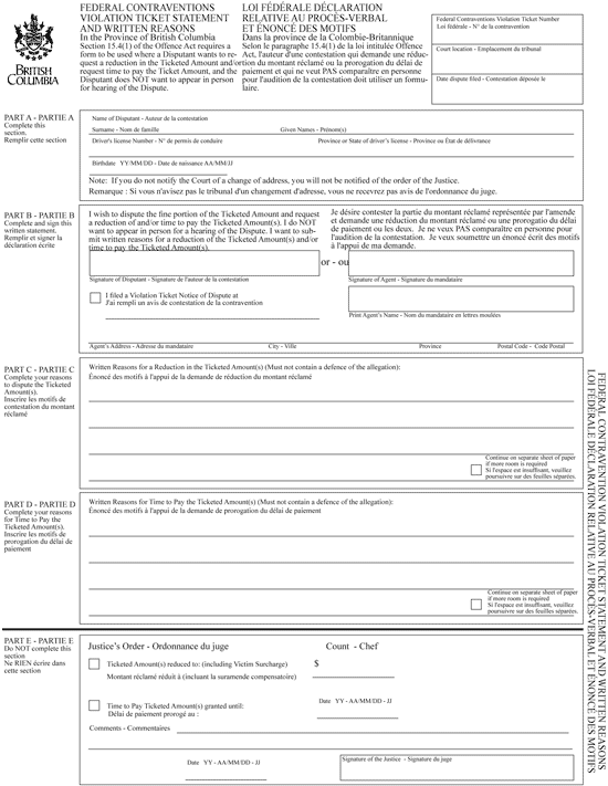 (a) the notice of dispute form to be bound to the copy of the violation ticket given to the person alleged to have committed a contravention must be in Form E, and