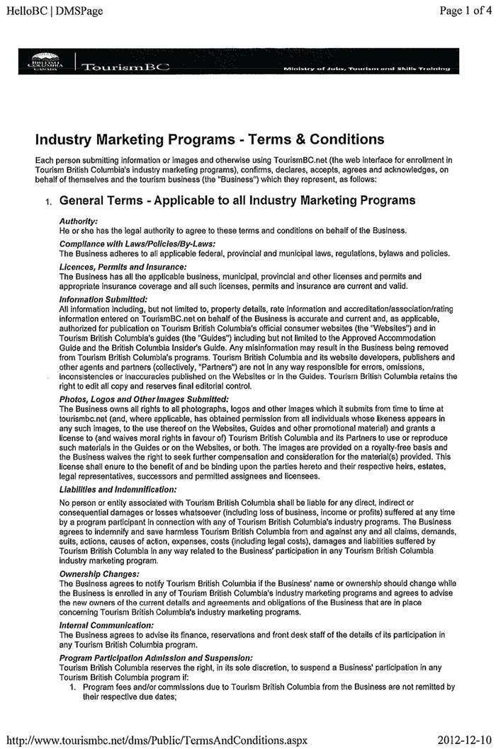 | TOURISM BRITISH COLUMBIA | Application No. 920557 | |