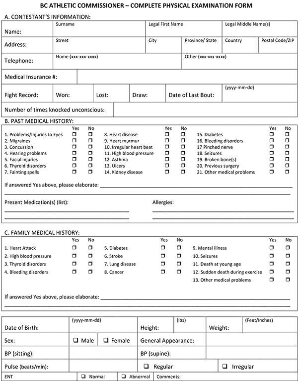 (b) the written report of a physician, in the English language, of a physical examination performed on the contestant by the physician in the 90-day period immediately preceding the date of the event, which report sets out the information required to complete the form set out as Schedule A;