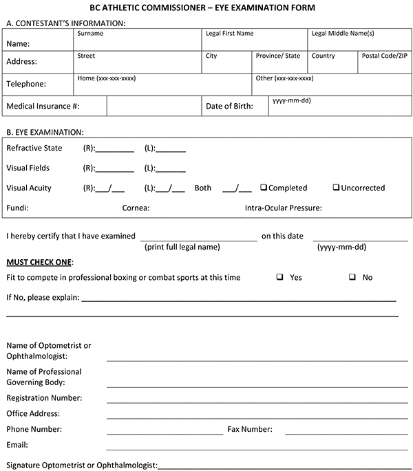 (a) the written report of an ophthalmologist or optometrist, in the English language, of an eye examination performed on the contestant by the ophthalmologist or optometrist in the 90-day period immediately preceding the date of the event, which report sets out the information required to complete the form set out as Schedule B;