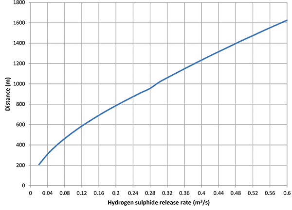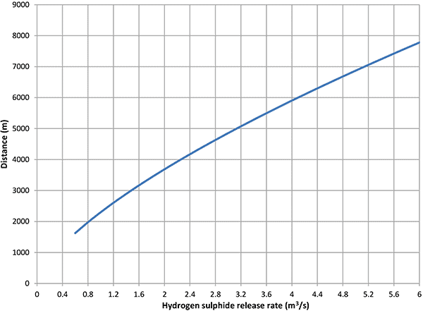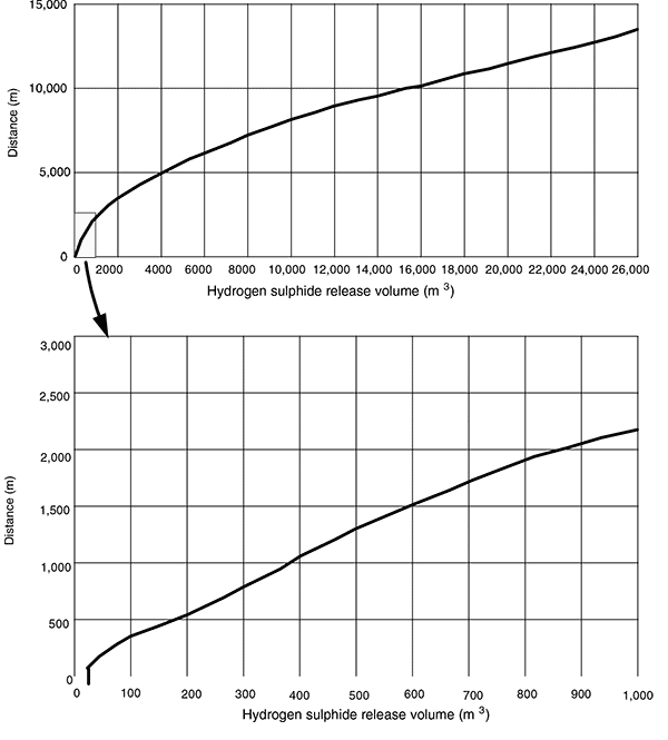 Hazard planning distances for pipelines are determined by reference to the maximum potential hydrogen sulphide release volume from the pipeline, calculated in accordance with the applicable of the following equations. The hazard planning distance for pipelines is the distance indicated on the vertical axis of Chart C that corresponds to the release volume indicated on the horizontal axis of the chart, as indicated by the graphline on the chart.
