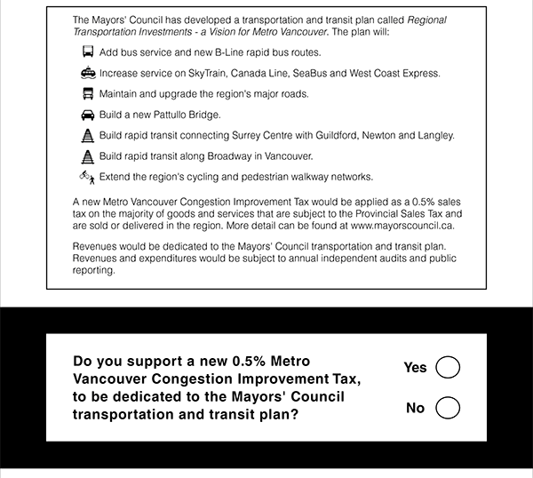 "Mayors' Council transportation and transit plan" means the plan entitled "Regional Transportation Investments — a Vision for Metro Vancouver", also known as the "Mayors' Transportation and Transit Plan", published on the website maintained by or on behalf of the mayors' council on regional transportation;