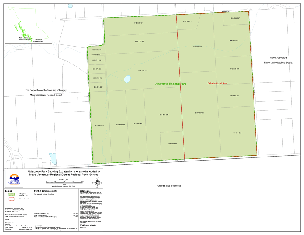 "Aldergrove Regional Park" means the area shaded in green, identified as Aldergrove Regional Park, on the map titled "Aldergrove Park Showing Extraterritorial Area to be Added to Metro Vancouver Regional District Regional Parks Service" with map reference number RD 13-06, dated August 30, 2019, attached to this regulation;