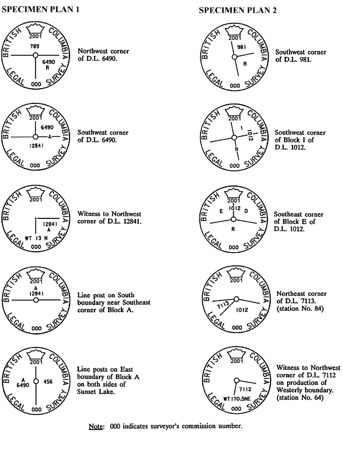 (3) The surveyor must indicate diagrammatically on the cap the directions of the boundary lines, and the designations of the district lots, sections, blocks and quarters adjoining the corner, together with the year in which the post was set and the registry number of the land surveyor's commission.