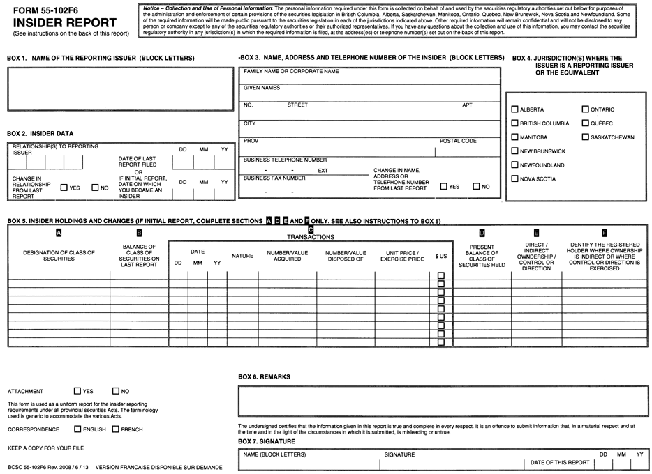If the report is filed by facsimile in accordance with National Instrument 55-102 System for Electronic Disclosure by Insiders (SEDI), the report should be sent to the applicable securities regulatory authority at the fax number set out below.