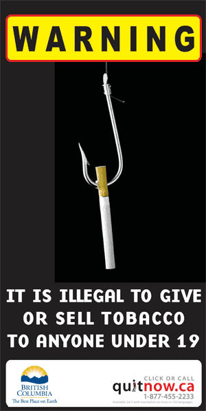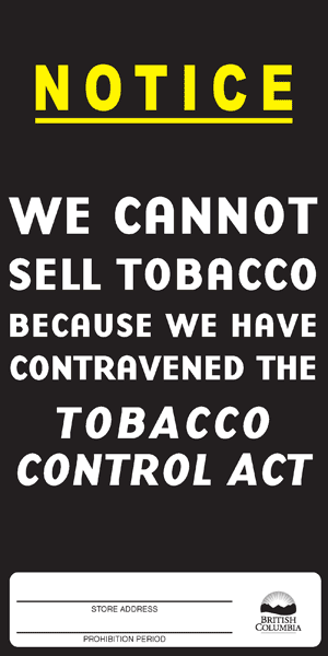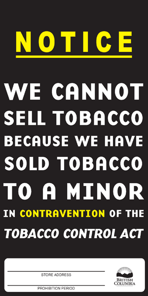 "NOTICE: WE CANNOT SELL TOBACCO BECAUSE WE HAVE SOLD TOBACCO TO A MINOR IN CONTRAVENTION OF THE TOBACCO CONTROL ACT.";