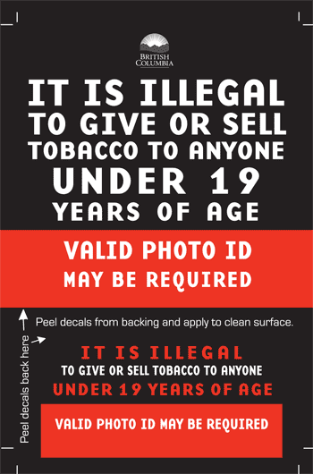 "IT IS ILLEGAL TO GIVE OR SELL TOBACCO TO ANYONE UNDER 19 YEARS OF AGE. VALID PHOTO ID MAY BE REQUIRED.";