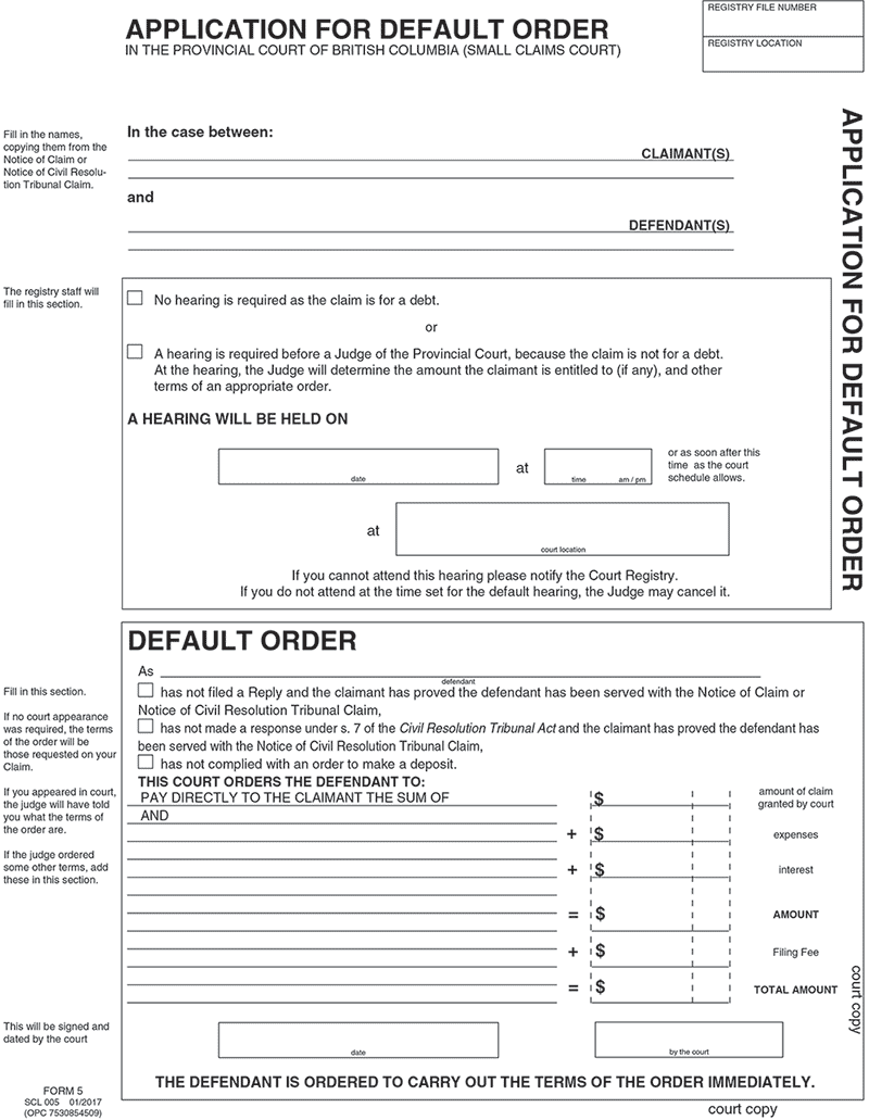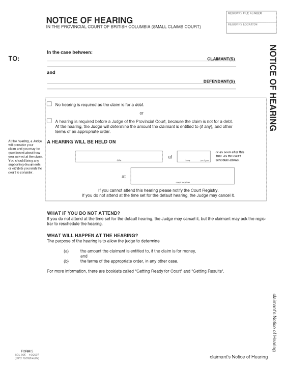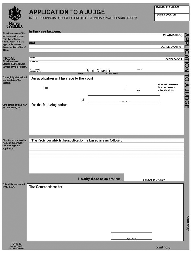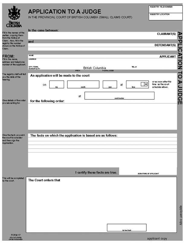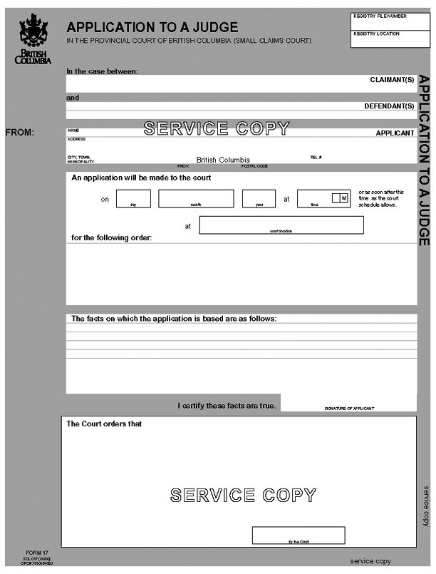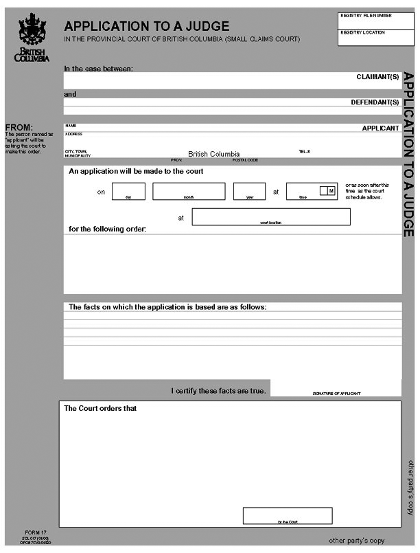 You may need to contact a court registry in British Columbia to obtain Small Claims forms to fill out. This website lists court locations: http://www.ag.gov.bc.ca/courts/overview/locations.htm