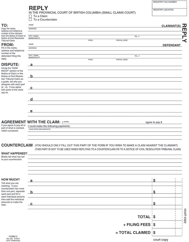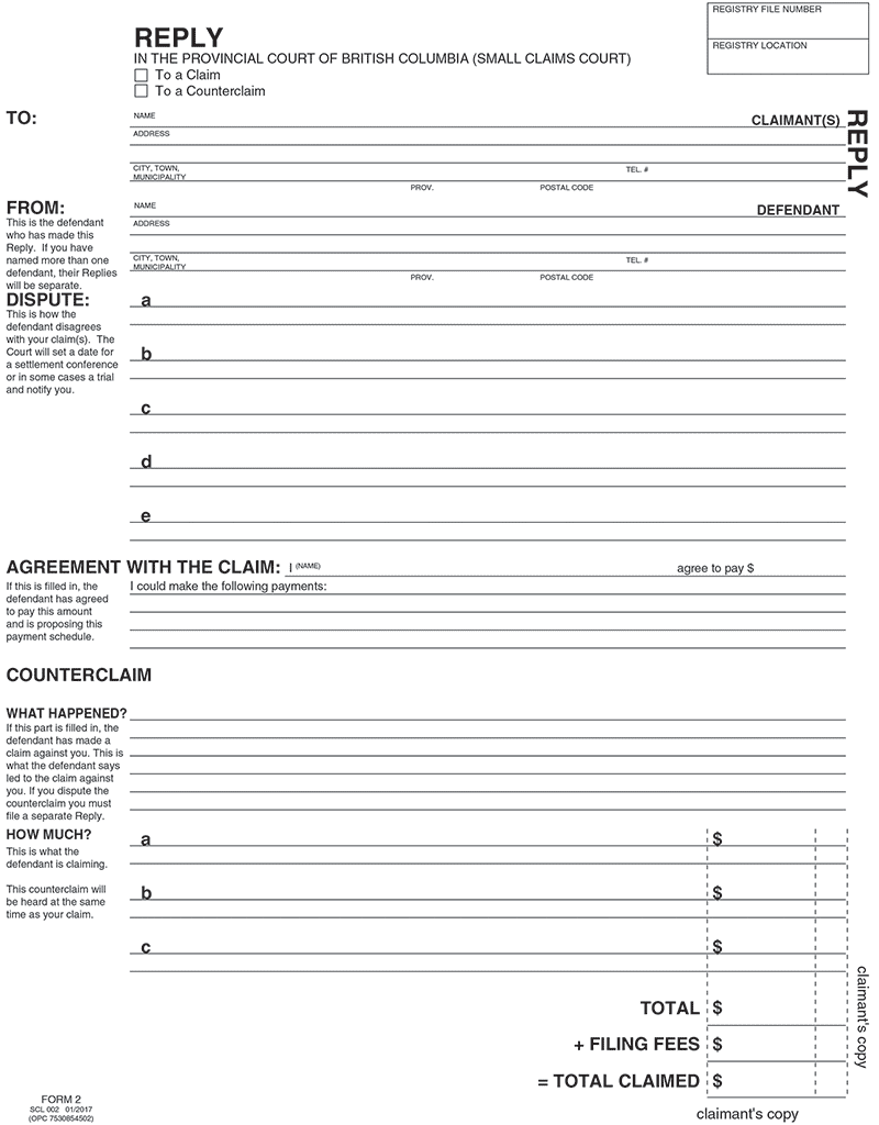 (22) A defendant must file a reply at the registry where the notice of civil resolution tribunal claim was filed and, except where the defendant has agreed to pay all of the claim, pay the required fee.