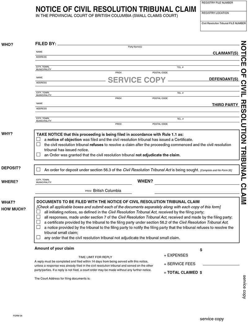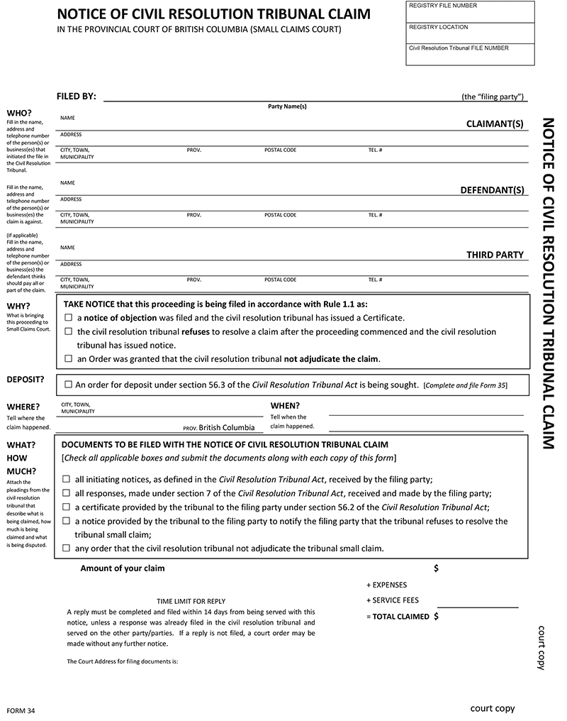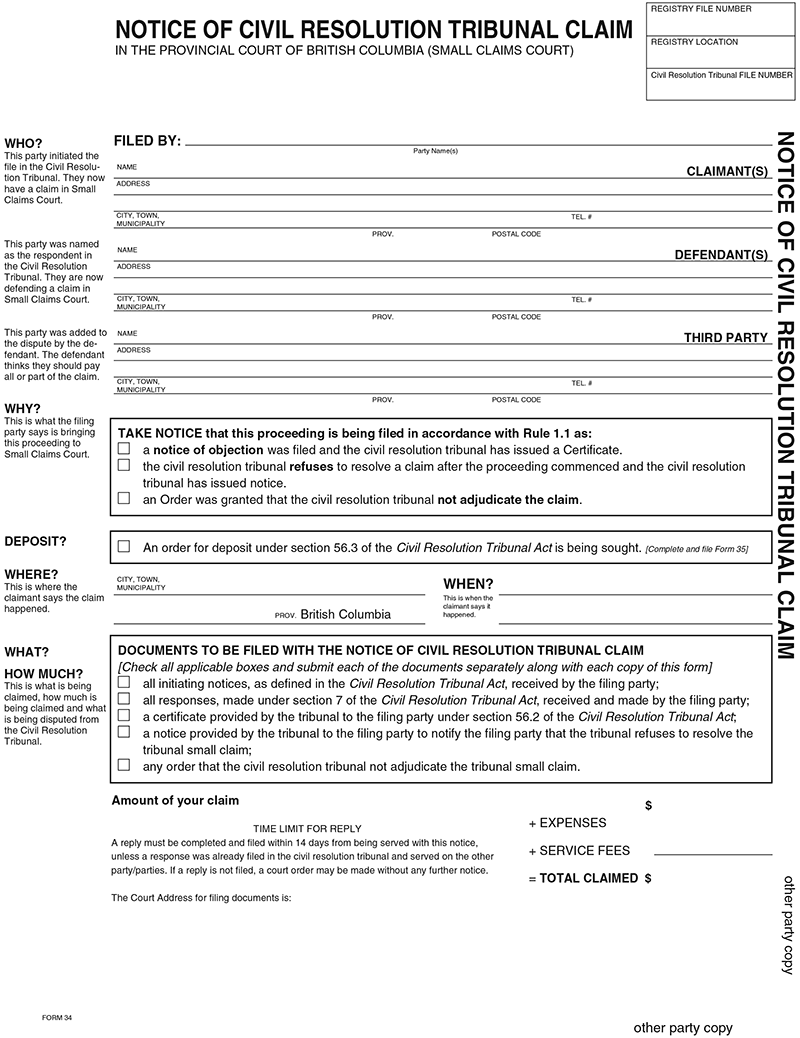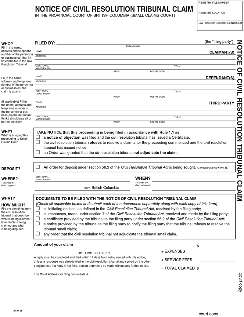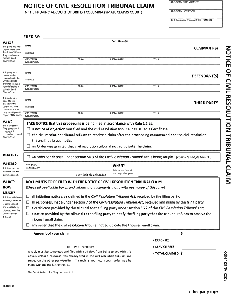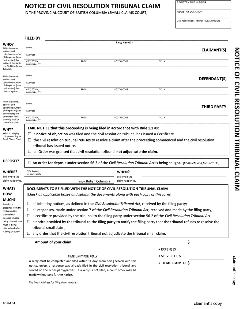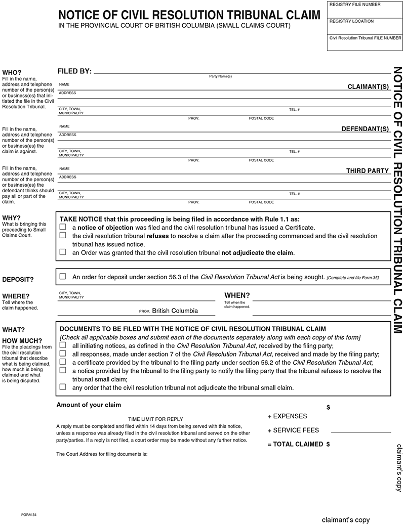 (3) To make a claim in respect of which this rule applies, a person must complete a notice of civil resolution tribunal claim (Form 34) following the instructions on the form.