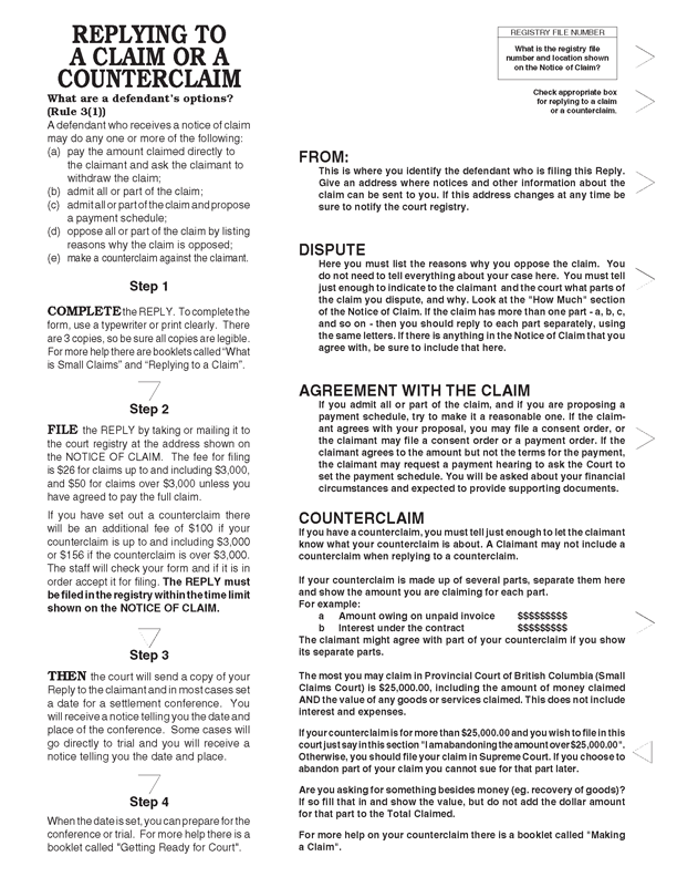 (3) A defendant must file a reply at the registry where the notice of claim was filed and, except where the defendant has agreed to pay all of the claim, pay the required fee.