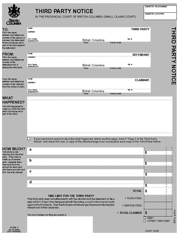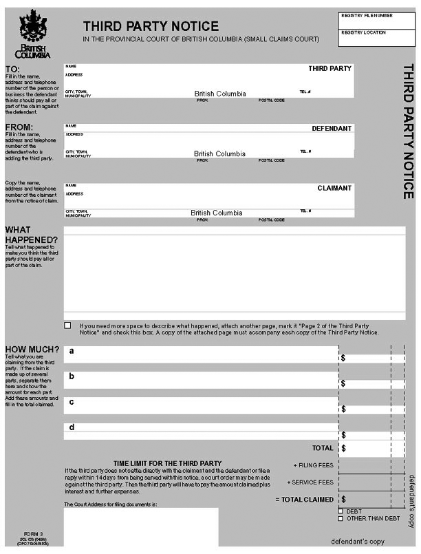 (2) The defendant must file a third party notice at the registry where the notice of claim was filed and pay the required fee.
