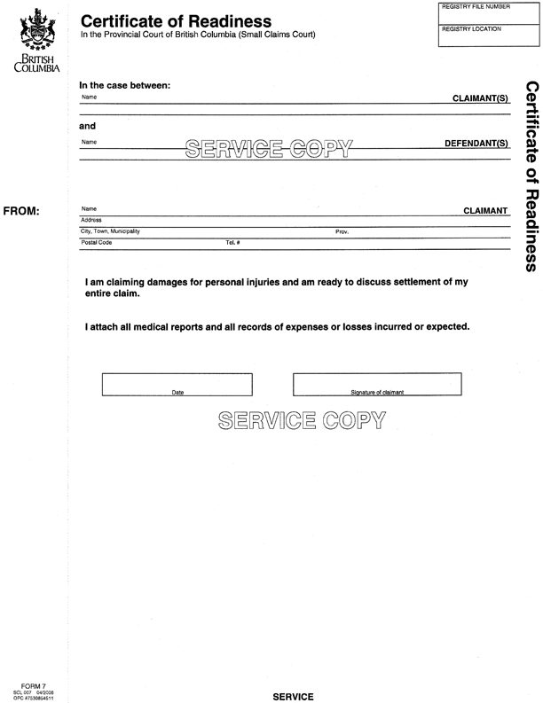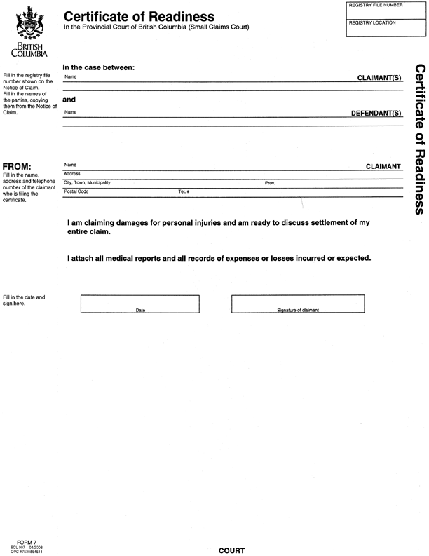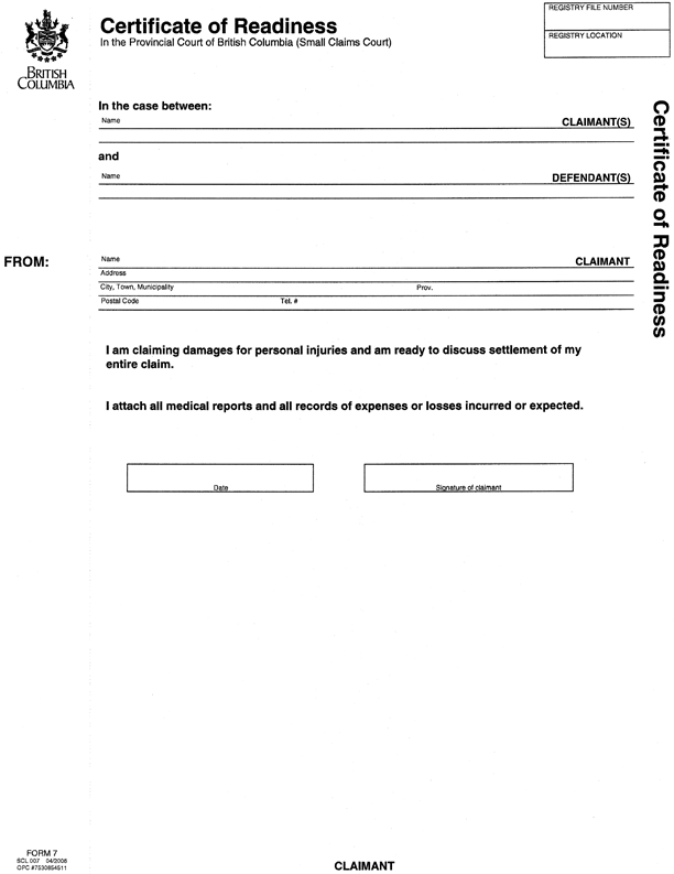 (9) In a claim for damages for personal injuries, the claimant must file at the registry, within 6 months after serving the notice of claim and before a settlement conference is held, a certificate of readiness (Form 7) that has attached copies of all
