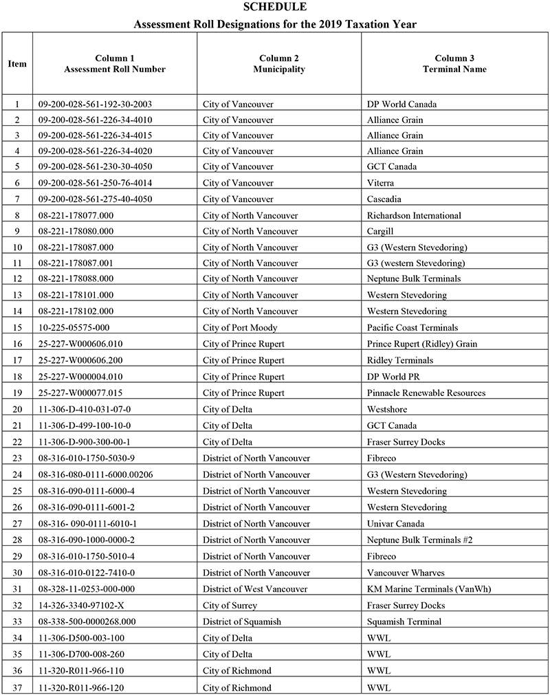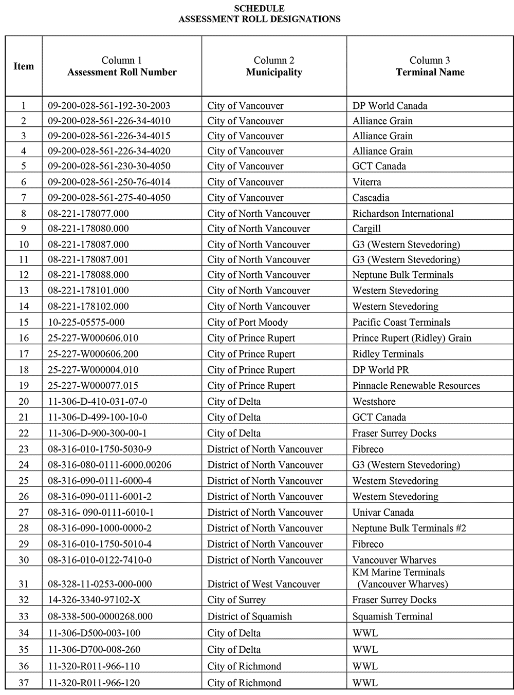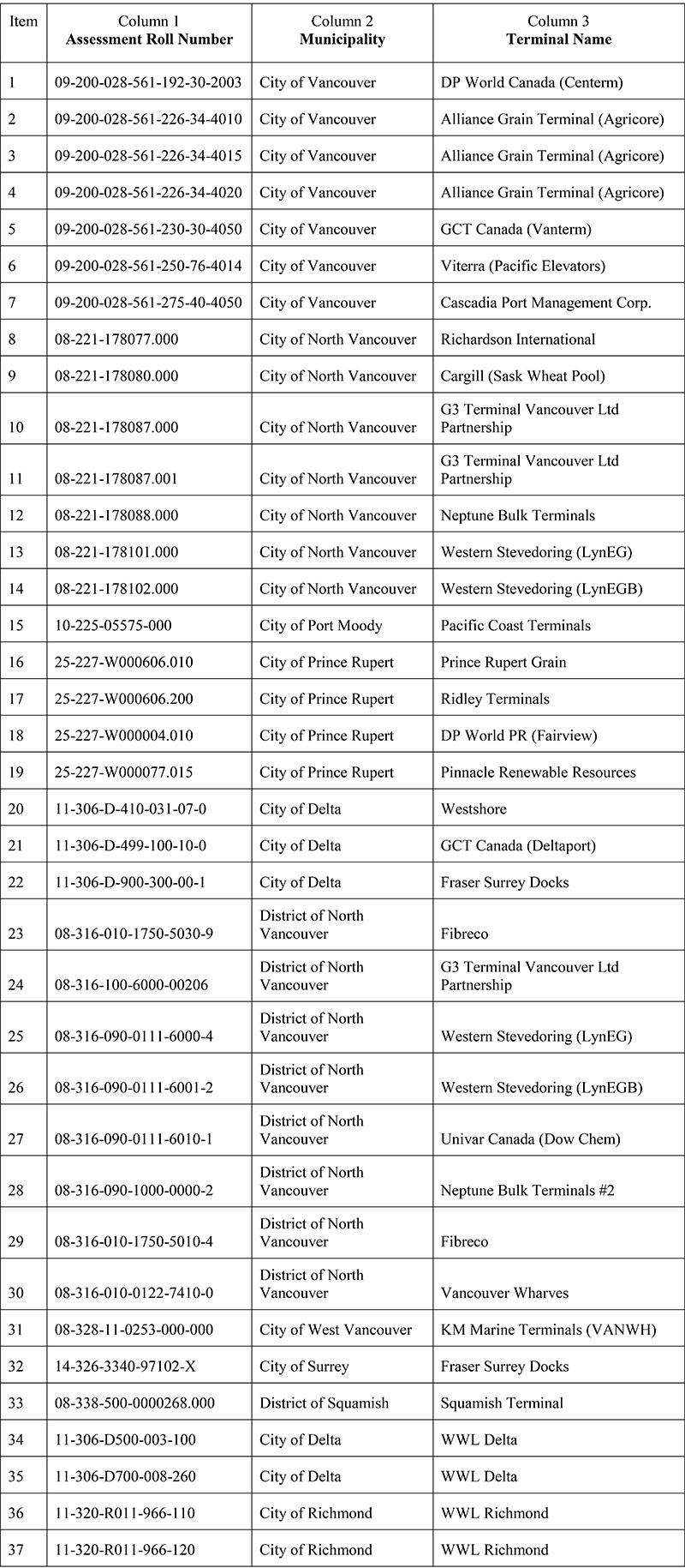 | Item | Column 1 Assessment Roll Number | Column 2 Municipality | Column 3 Terminal Name |
