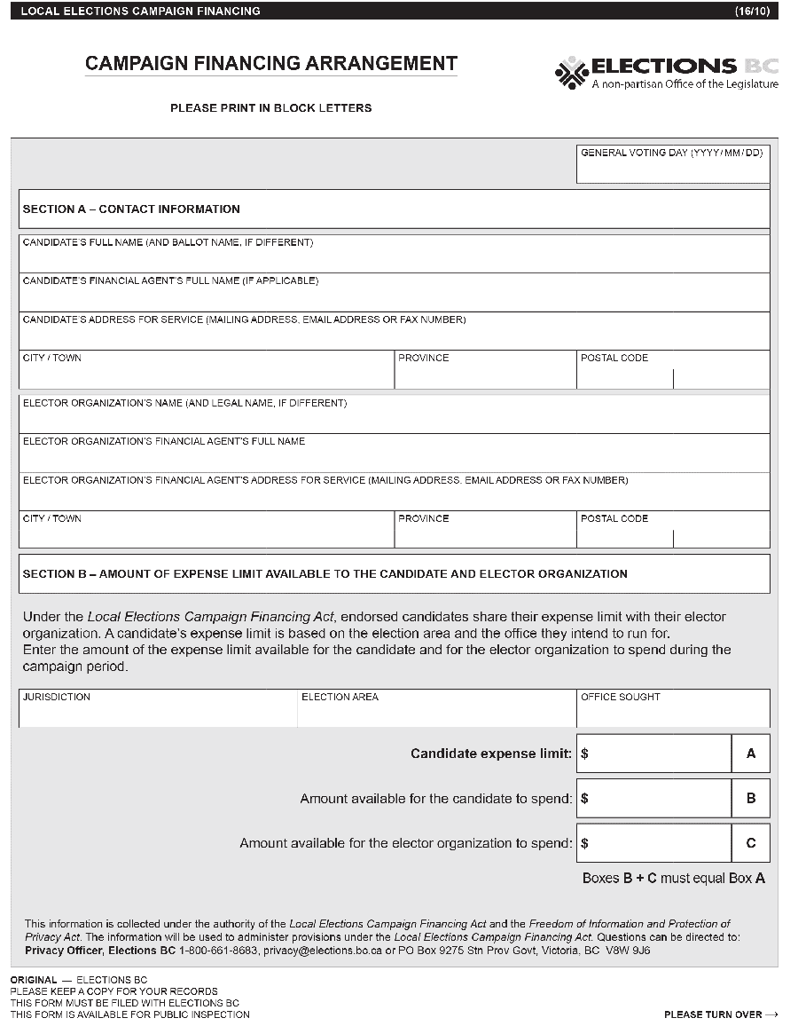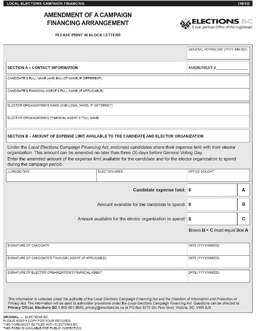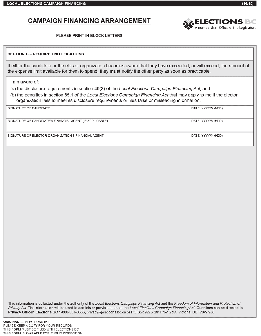 (k) a requirement that the candidate file a copy of the completed campaign financing arrangement, including a copy of a completed campaign financing arrangement as amended under section 63.10 of the Act, if applicable as soon as practicable with the BC chief electoral officer;