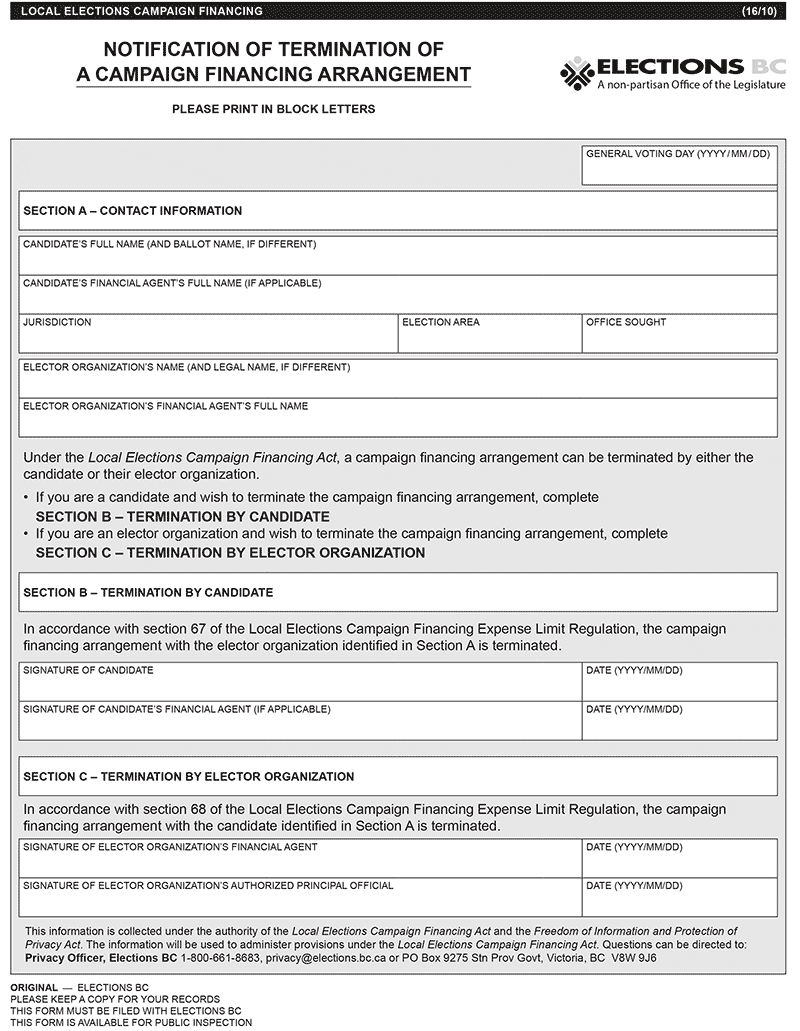 (a) the financial agent of the elector organization must complete the notification in the prescribed form of termination;
