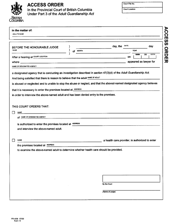 "access order" means an order under section 49 (2) of the Act authorizing either or both of the following: