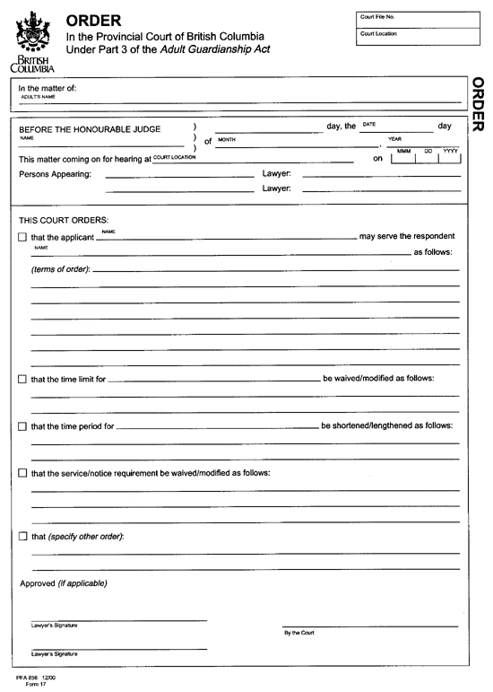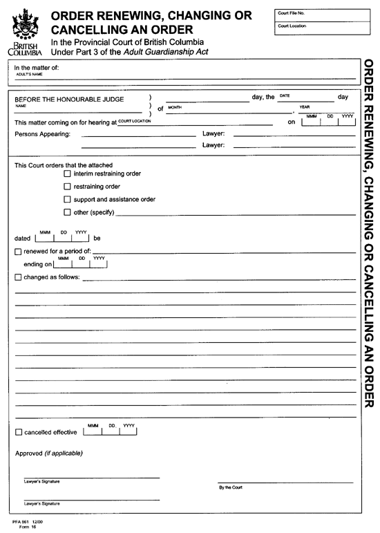 (d) in Form 16 in the case of an order renewing, changing or cancelling another order, and