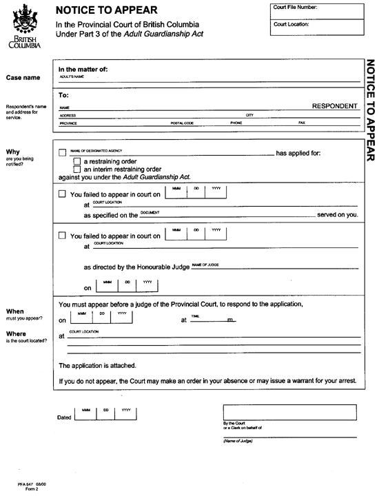 (2) If a draft notice to appear (Form 2) is filed with an application for an interim restraining order or a restraining order, a clerk must complete the notice to appear and issue it to the applicant.
