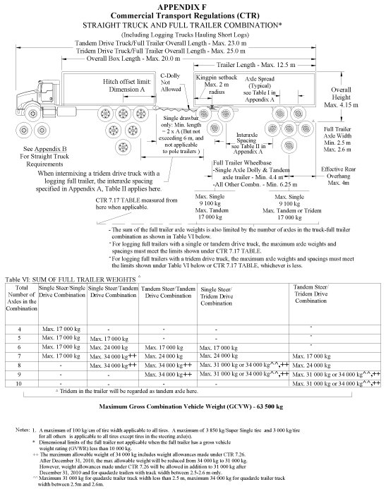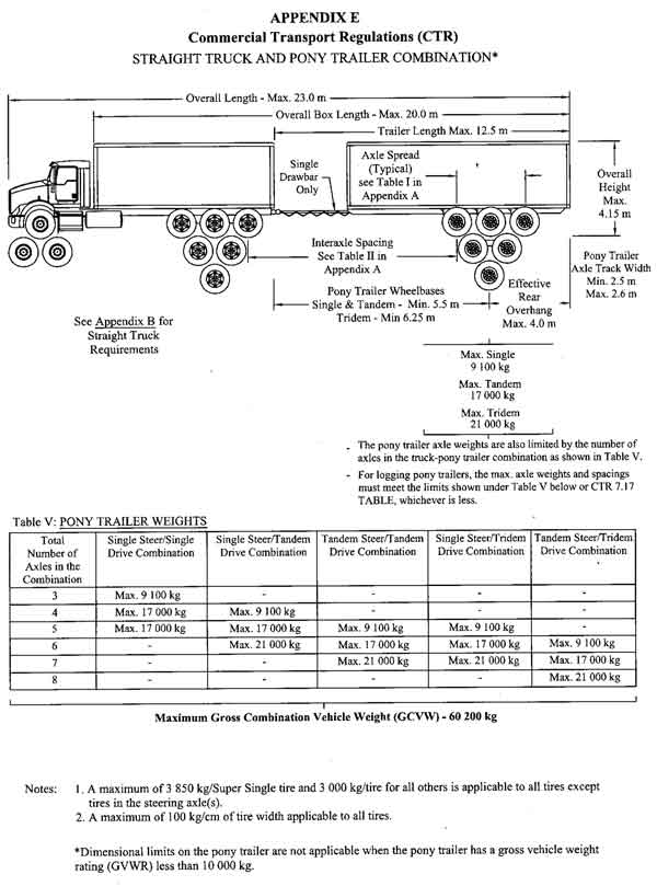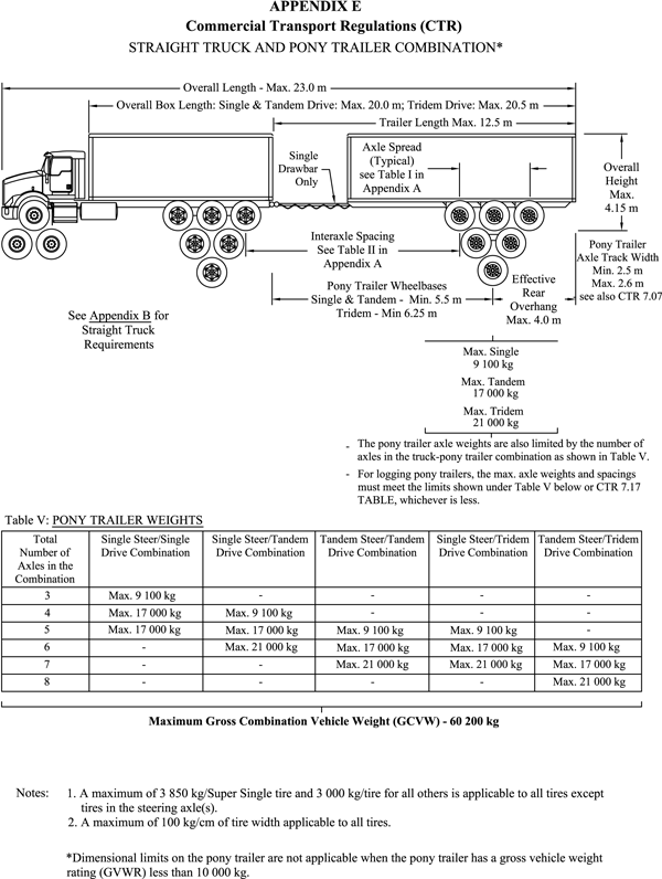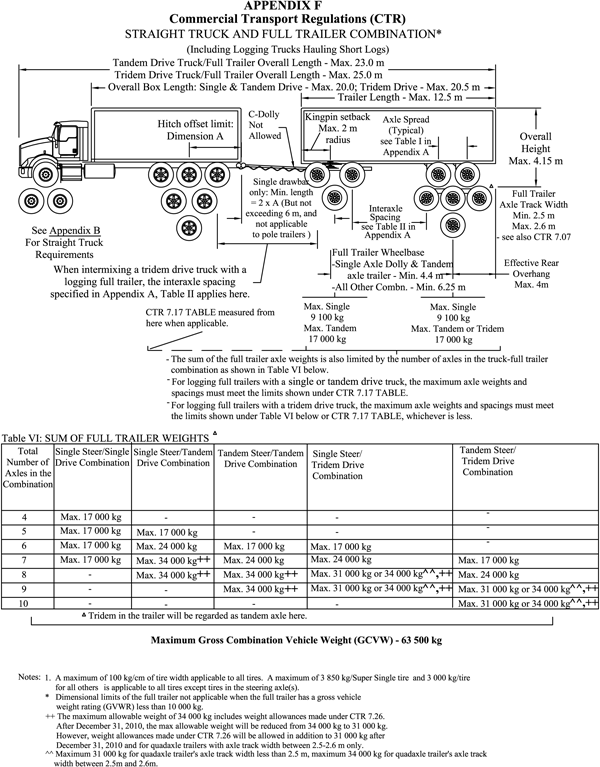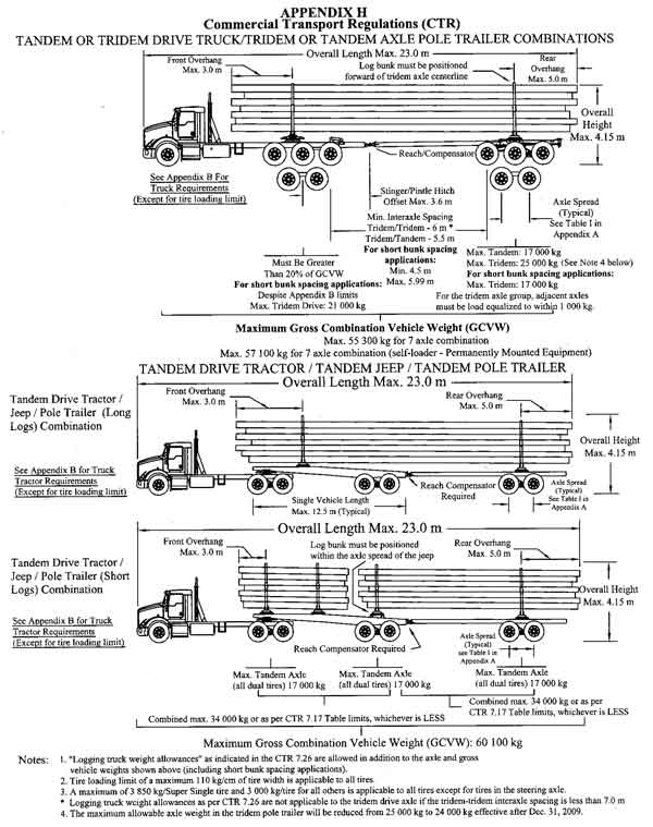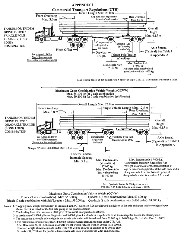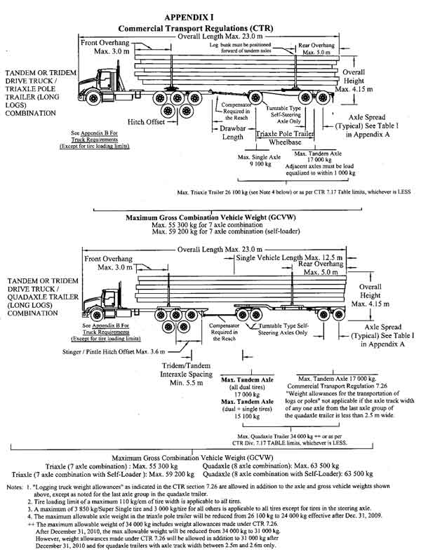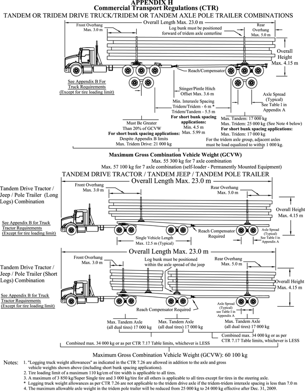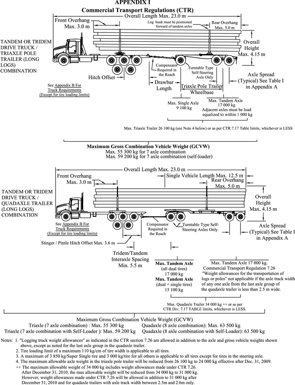 (2) Despite the limitations set out in the Appendices and subject to the manufacturer's rated capacity for the tire, a logging truck in combination with a pole trailer used to haul long logs may have a tire loading of 110 kg per 1.0 cm of tire width.