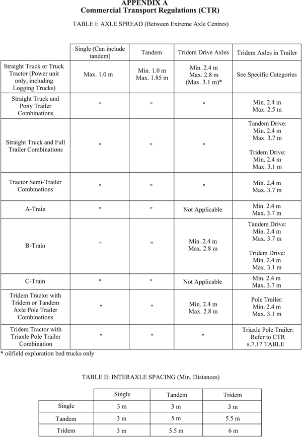 "tridem drive axle" means 3 equally spaced consecutive engine-driven axles having an axle spread of not less than 2.4 m and not more than 2.8 m, and an axle track width of not less than 2.4 m and not more than 2.6 m for axles that are equipped with either dual wheels or tires, or an axle track width of not less than 2.5 m and not more than 2.6 m for axles that are equipped with super single tires on each track;