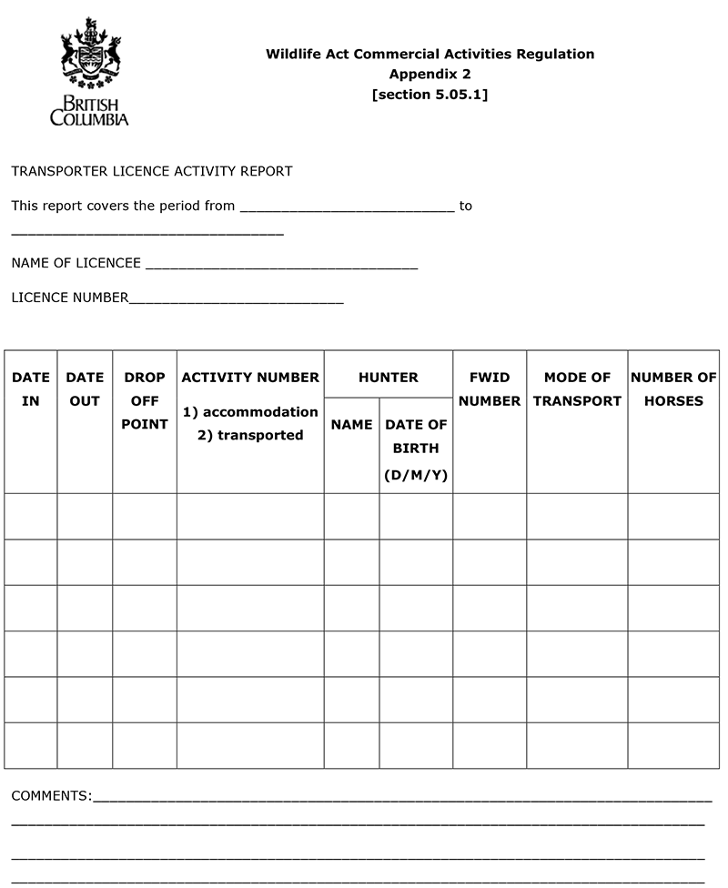 | TRANSPORTER LICENCE ACTIVITY REPORT This report covers the period from ........................................ to ........................................ NAME OF LICENSEE ................................................................................................... LICENCE #....................................... | |||||||||||||||||||||||||||||||||||||||||||||||||||||||||||||||||