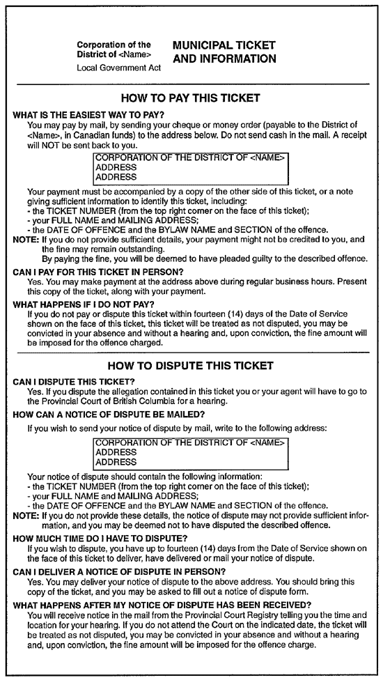 (3) The instructions to be printed on the reverse side of the copy of the ticket given to the person alleged to have contravened a bylaw must be