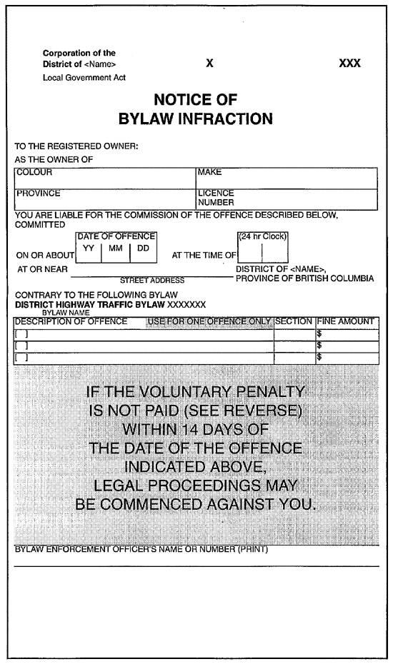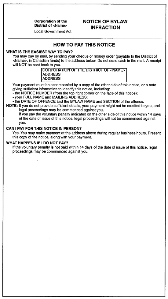 (5) The instructions to be printed on the reverse side of the notice of bylaw infraction must be in Form B.4