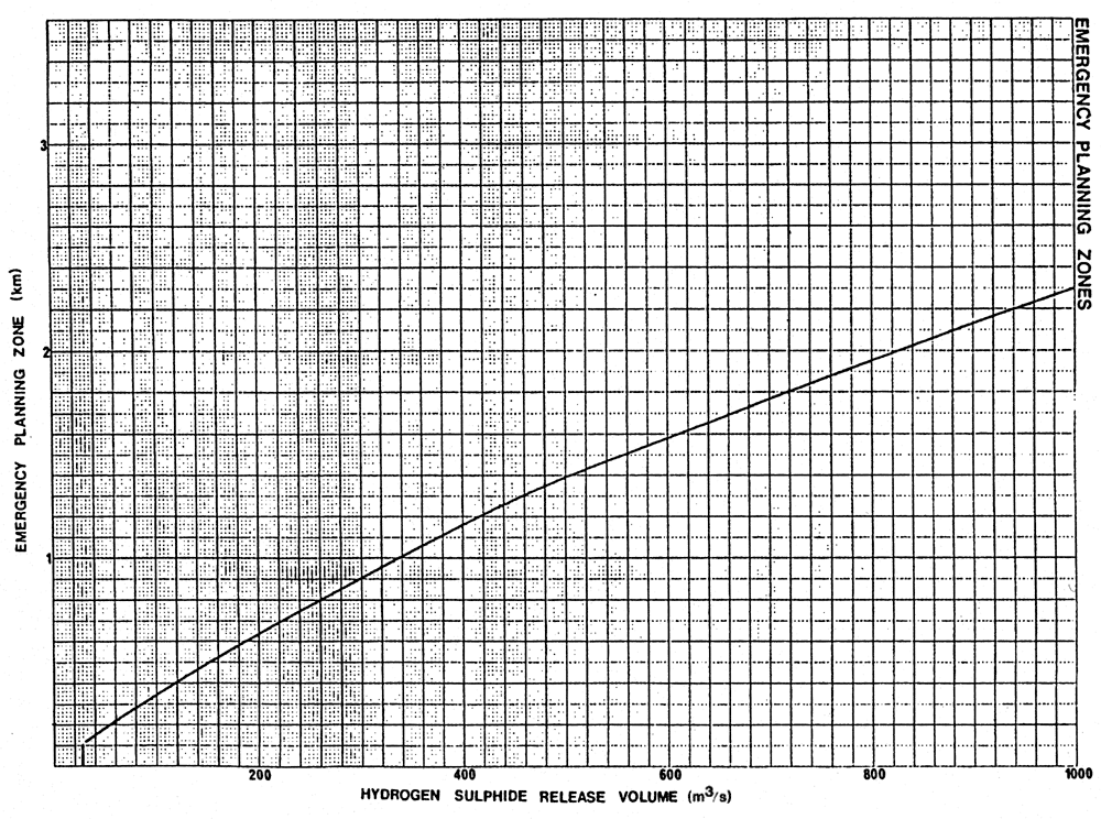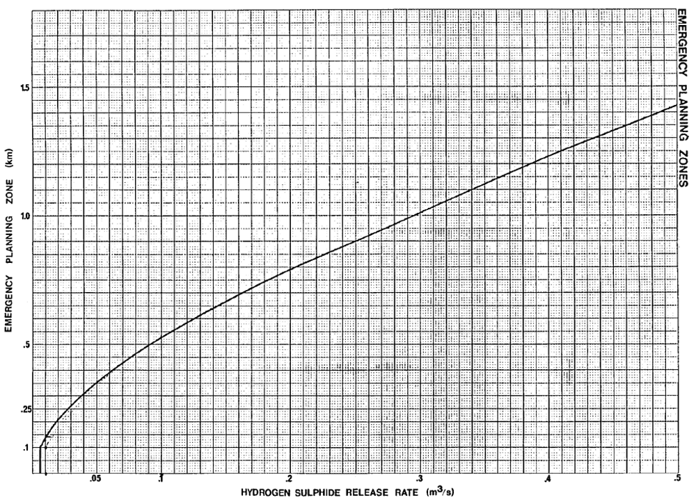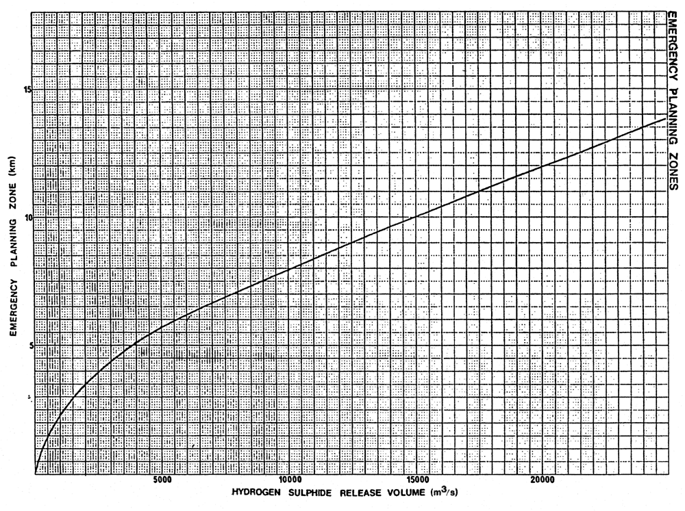 (2) The emergency planning zone of a sour pipeline is the area within a parameter formed by using the hydrogen sulphide release rate in metres per second or volume in cubic metres for the sour pipeline and finding the corresponding distance in kilometres using the graphs set out in the Schedule to this regulation.