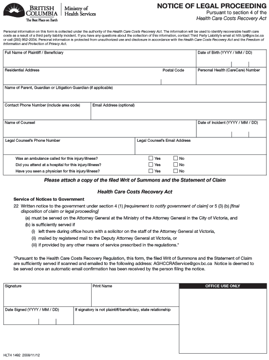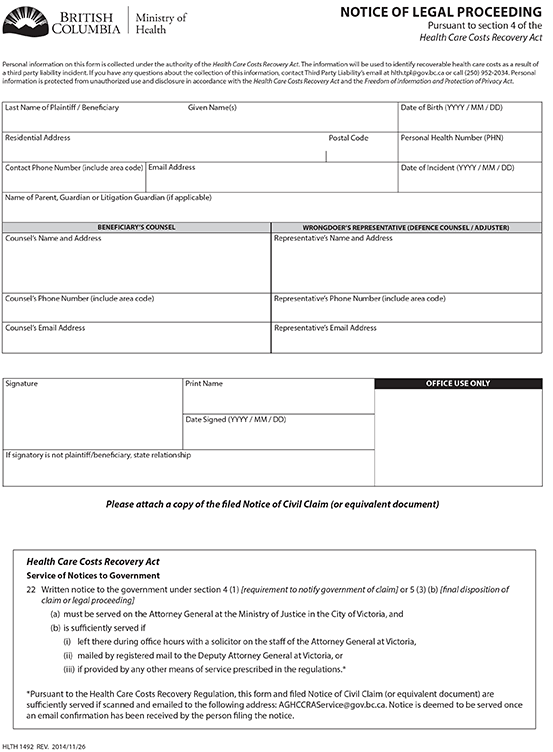 Schedule Form "Notice of Legal Proceeding Pursuant to section 4 of the Health Care Cost Recovery Act" BEFORE repealed by BC Reg 153/2020, effective June 26, 2020.