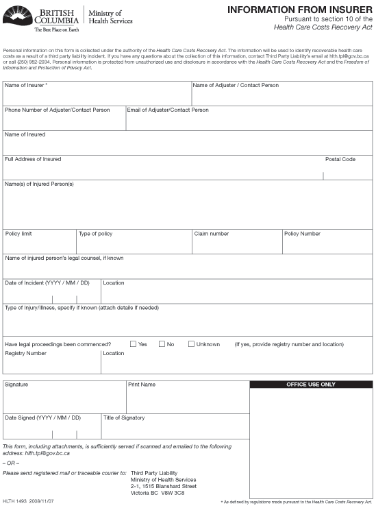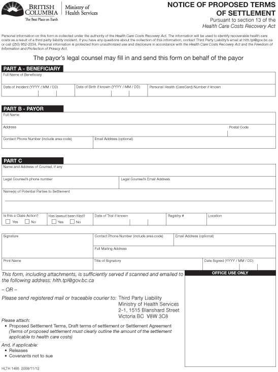 Schedule Form "Notice of Legal Proceeding Pursuant to section 4 (1.1) of the Health Care Cost Recovery Act" was enacted by BC Reg 153/2020, effective June 26, 2020.