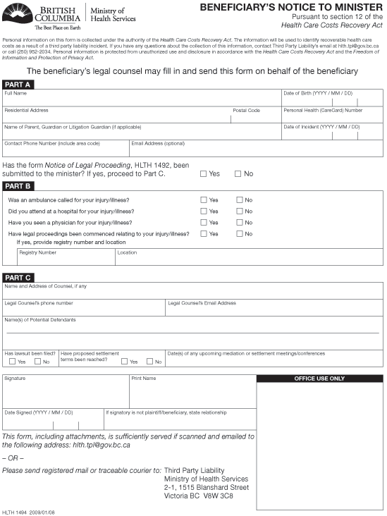 Schedule Form "Notice of Legal Proceeding Pursuant to section 4 (1) of the Health Care Cost Recovery Act" was enacted by BC Reg 153/2020, effective June 26, 2020.