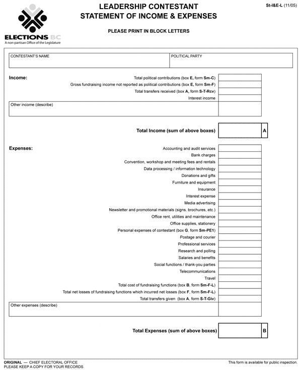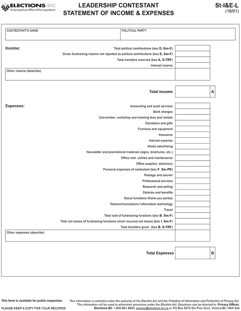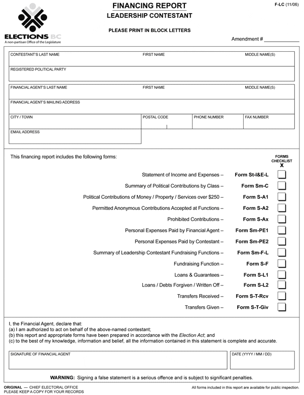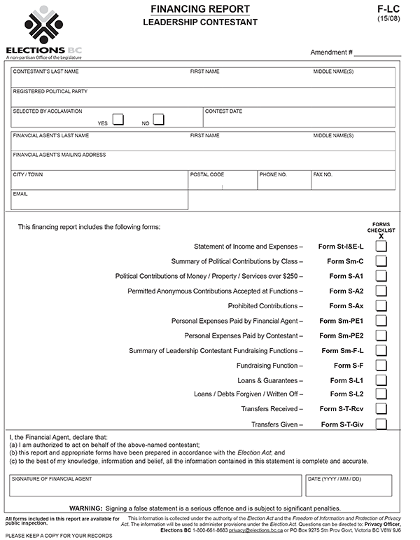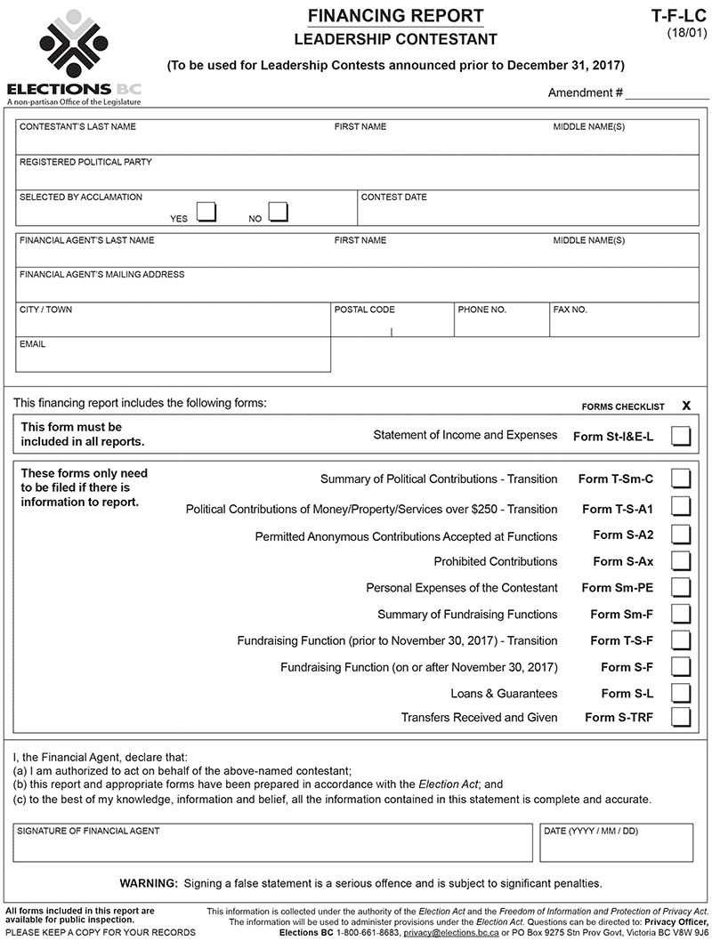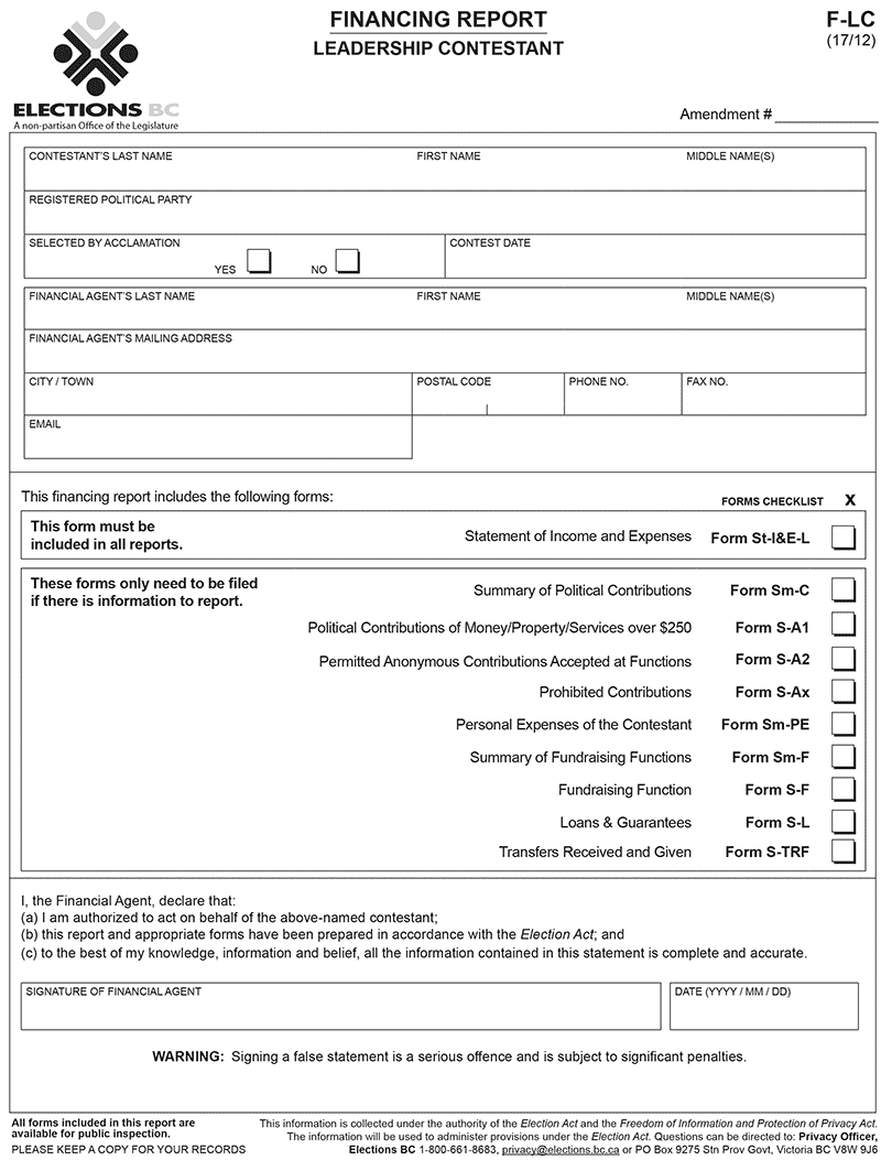 Schedule forms "Leadership Contestant Financing Report Form" and "Leadership Contestant Statement of Income and Expenses" were amended by BC Reg 124/2011, effective July 14, 2011.