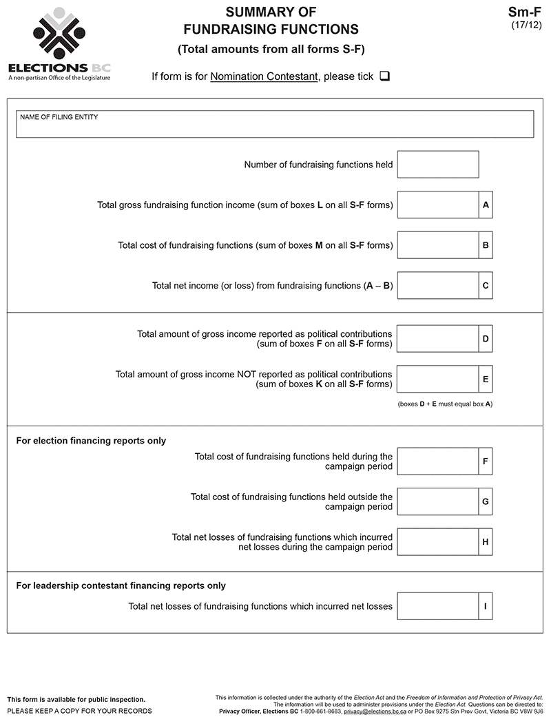 Schedule 1 form "Summary of Fundraising Functions" BEFORE amended by BC Reg 200/2015, effective November 2, 2015.