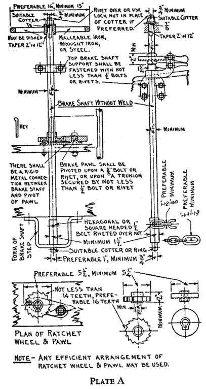 Brake ratchet wheel shall be secured to brake shaft by a key or square fit; said square fit shall be not less than 1 5/16 inches square. When ratchet wheel with square fit is used, provision shall be made to prevent ratchet wheel from rising on shaft to disengage brake pawl. (See Plate A)