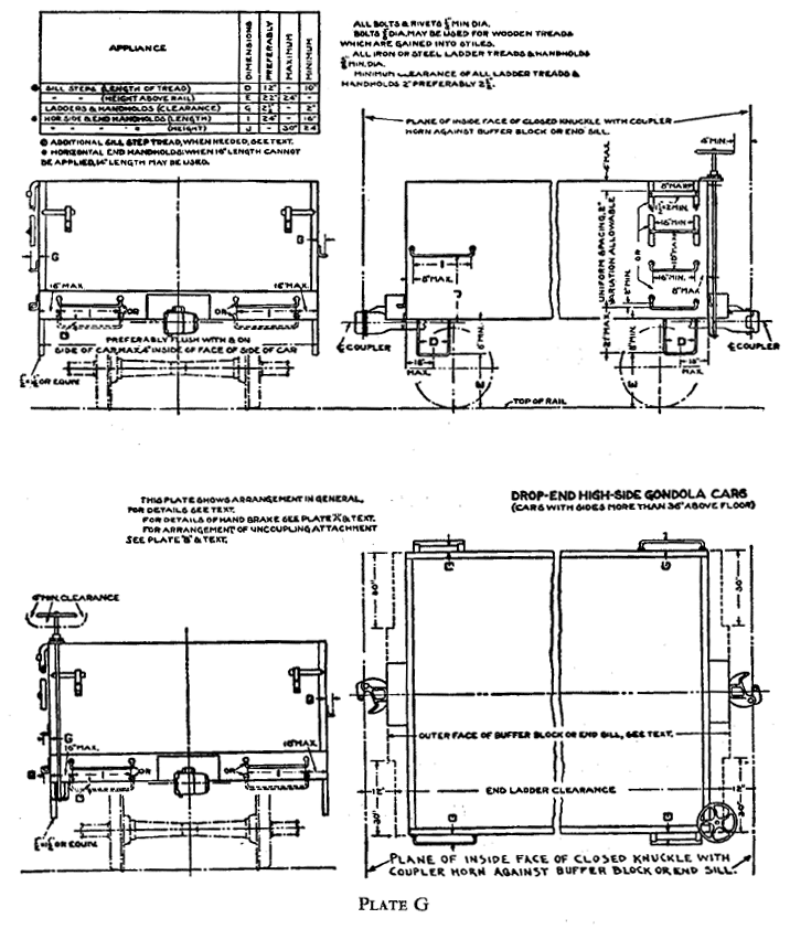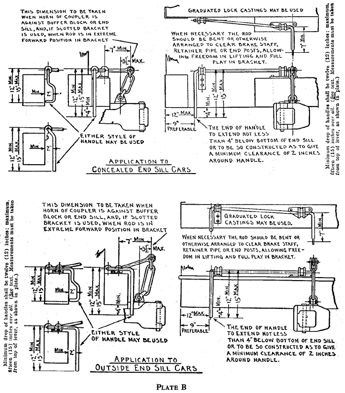 (2) Dimensions — Handles of uncoupling levers, except those shown on Plate B or of similar designs, shall be not more than 6 inches from sides of car.