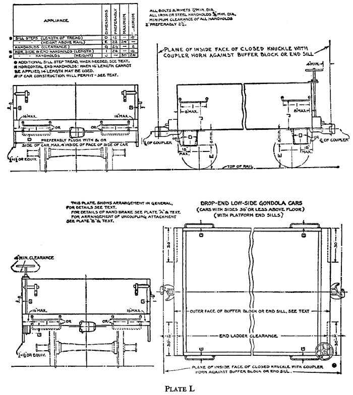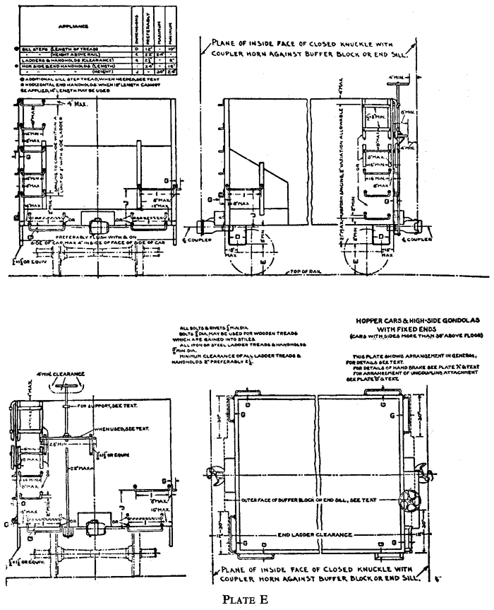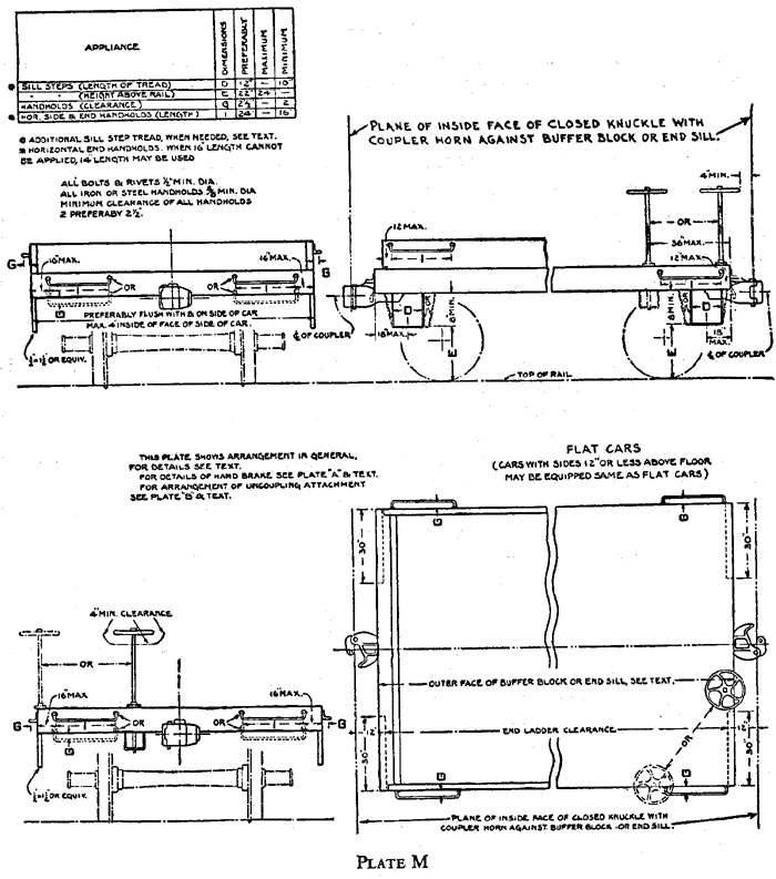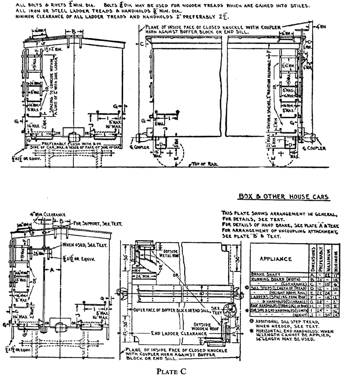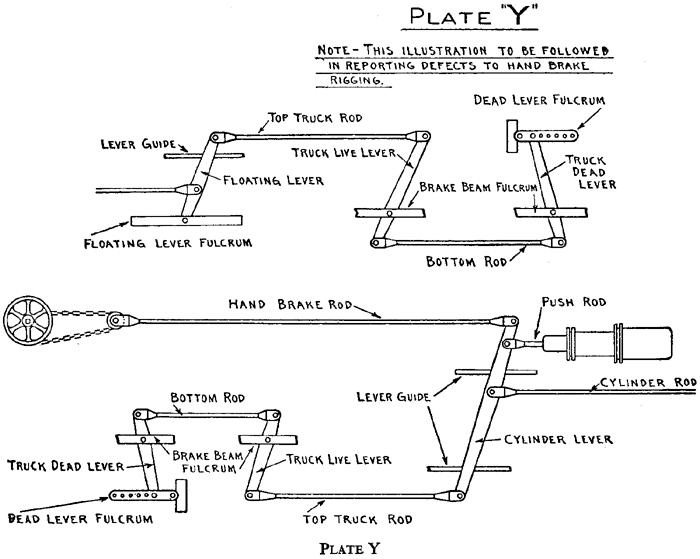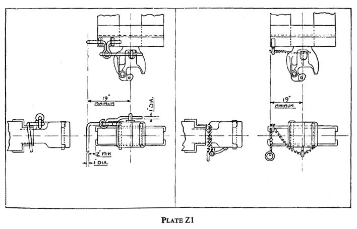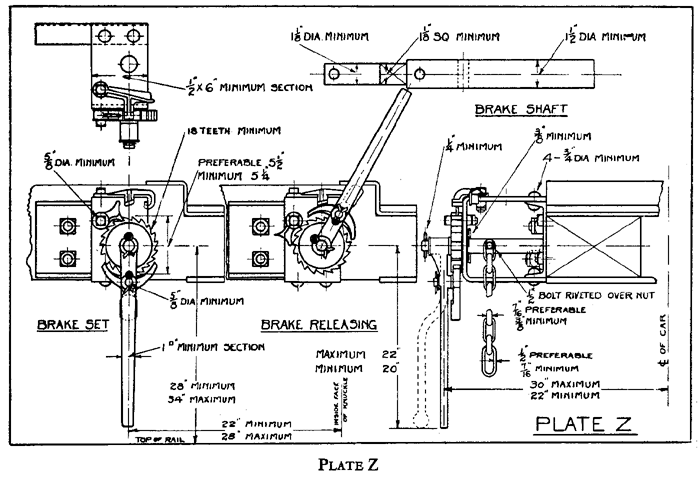 Brake chain shall be of not less than 3/8, preferably 7/16, inch wrought iron or steel, with a link on the brake rod end of not less than 7/16, preferably 1/2, inch wrought iron or steel, and shall be secured to brake shaft drum by not less than 1/2 inch hexagon or square headed bolt. Nut on said bolt shall be secured by riveting end of bolt over nut. (See Plate A)