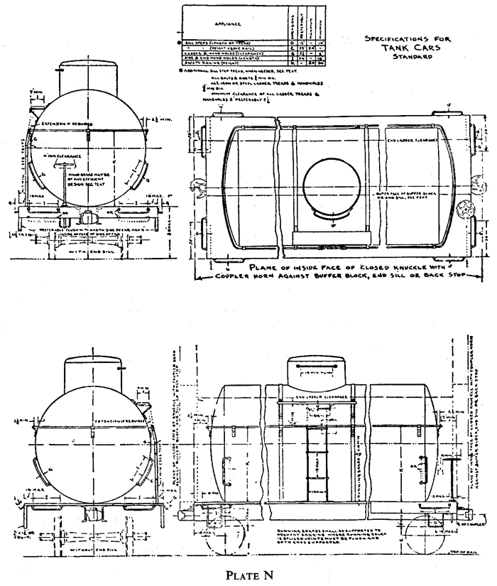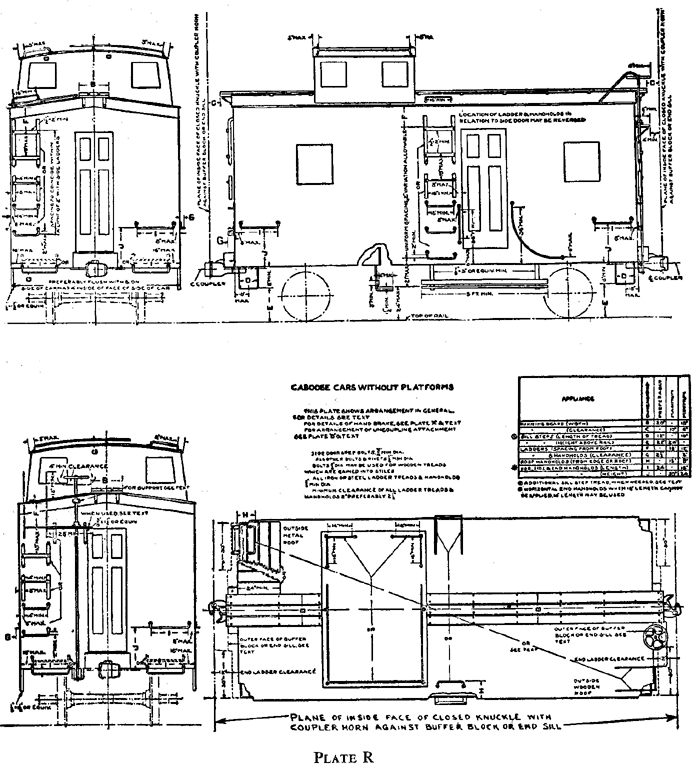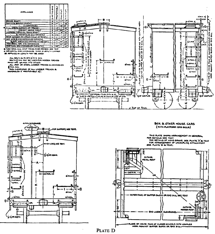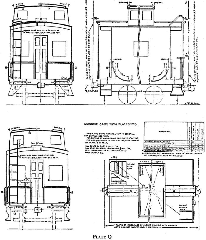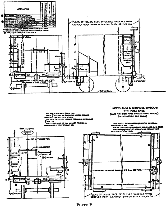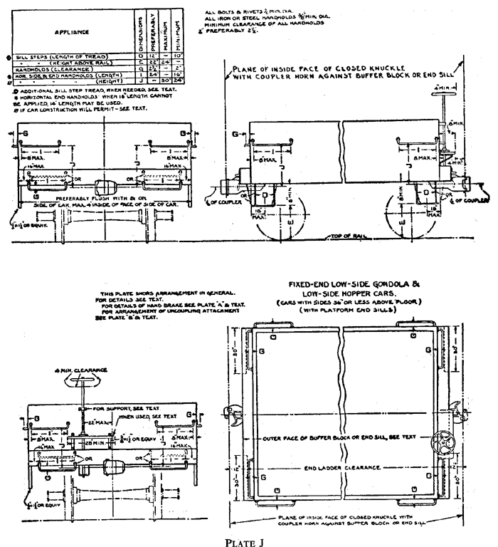 Brake chain shall be of not less than 3/8, preferably 7/16, inch wrought iron or steel, with a link on the brake rod end of not less than 7/16, preferably 1/2, inch wrought iron or steel, and shall be secured to brake shaft drum by not less than 1/2 inch hexagon or square headed bolt. Nut on said bolt shall be secured by riveting end of bolt over nut. (See Plate A)