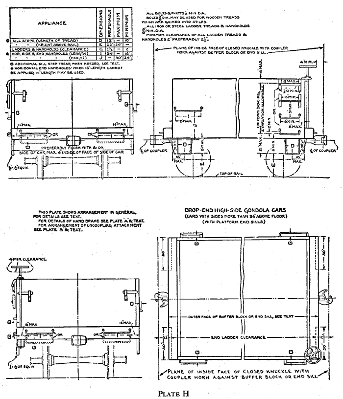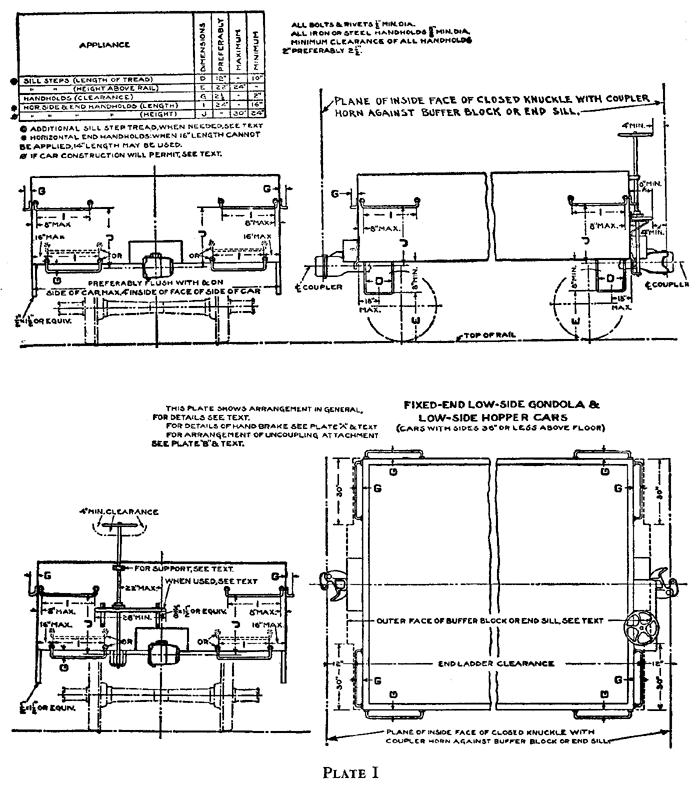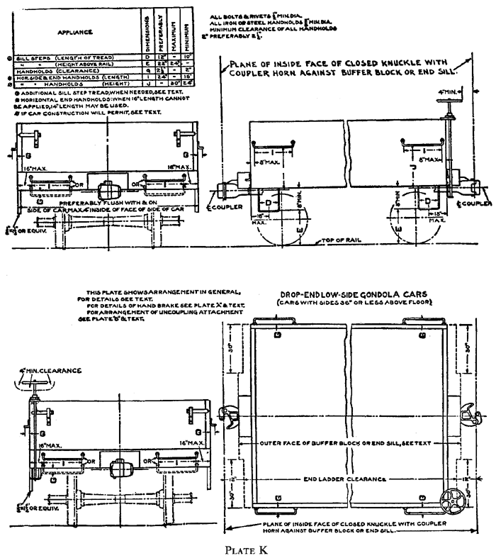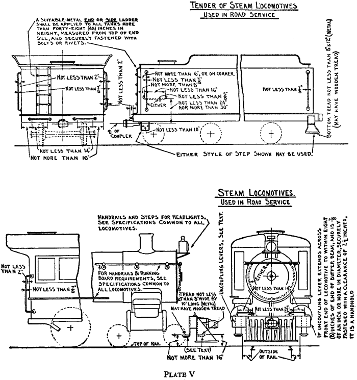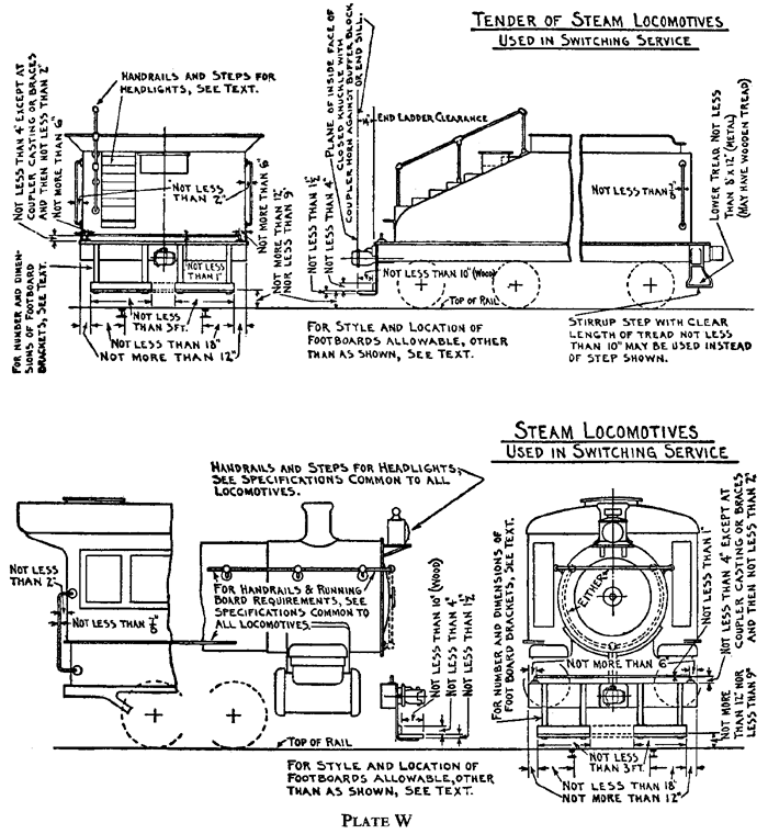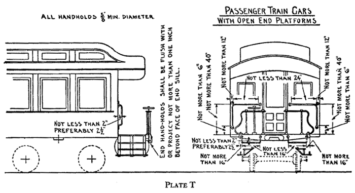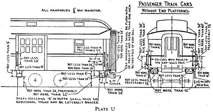 220 Where used, end platforms shall conform to the general arrangement shown herein on Plate Z6. End handrails shall be not less than one inch in diameter, with a minimum height of 3 feet from the platforms. Where end platforms are used, side steps and handrails shall be provided on each side of the locomotive. The steps shall be of material other than wood and the tread surface shall be of anti-skid design and constructed with sufficient open space to permit the elimination of snow and ice from the tread surface. Handrails shall exist on both sides of steps at appropriate heights and of the general design as shown herein on Plate Z6.