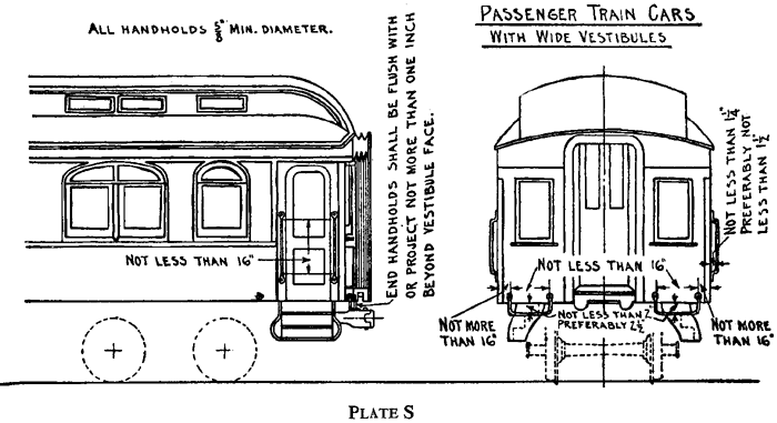 245 All end vestibules, vestibule doors, windows, floors, floor trap doors, fasteners, railings, steps, step treads, grab irons and all appurtenances with respect to the boarding and detraining of passengers and the accommodation of passengers with respect to passageway and access between passenger coaches coupled together shall be in accordance with A.A.R. standards for passenger train cars with wide vestibules (Division 10).