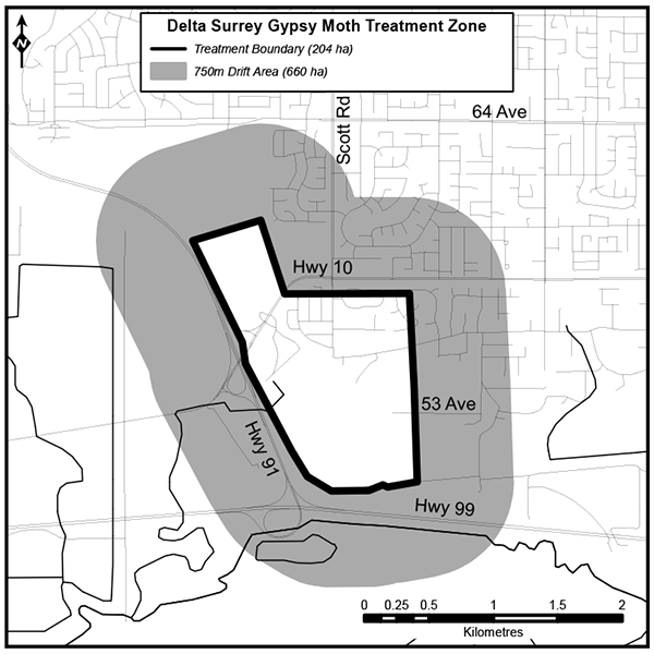 "Delta-Surrey Gypsy Moth Treatment Zone" means the treatment boundary outlined in black and the drift area shaded grey on the attached map referenced as the Delta-Surrey Gypsy Moth Treatment Zone;