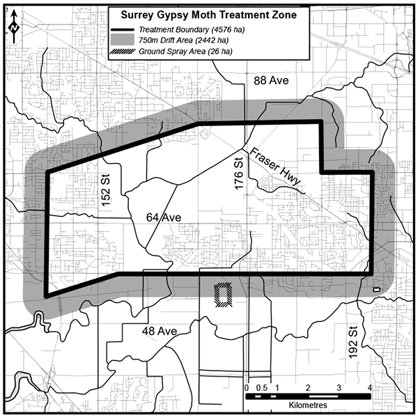 "Surrey Gypsy Moth Treatment Zone" means the treatment boundary outlined in black, the drift area shaded grey and the ground spray area cross-hatched on the attached map referenced as the Surrey Gypsy Moth Treatment Zone.