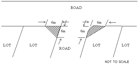 1 "Sight triangle" means the area formed by a triangle in the angle formed by the right of way boundaries or boundaries produced and 2 points on those boundaries 6 m from the point of intersection, as shown crosshatched in the diagram following: