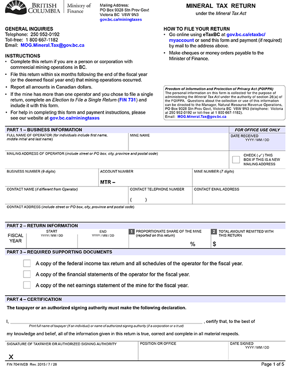 1 (1) A return delivered by an operator of a mine to the commissioner under section 12 (1) of the Mineral Tax Act must be in the form set out in Schedule A.