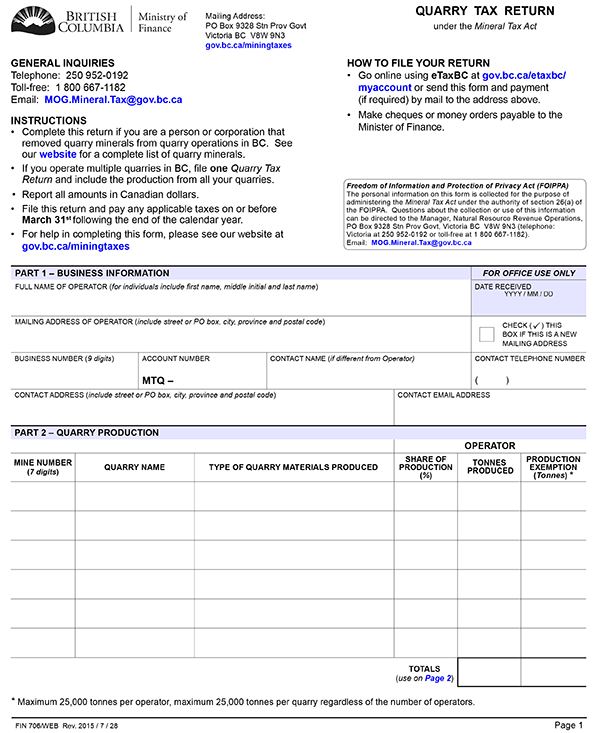 (3) A return delivered by a quarry operator to the commissioner under section 12 (1.2) of the Mineral Tax Act must be in the form set out in Schedule D.