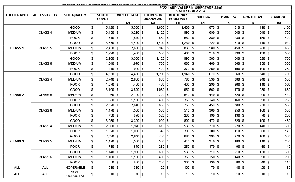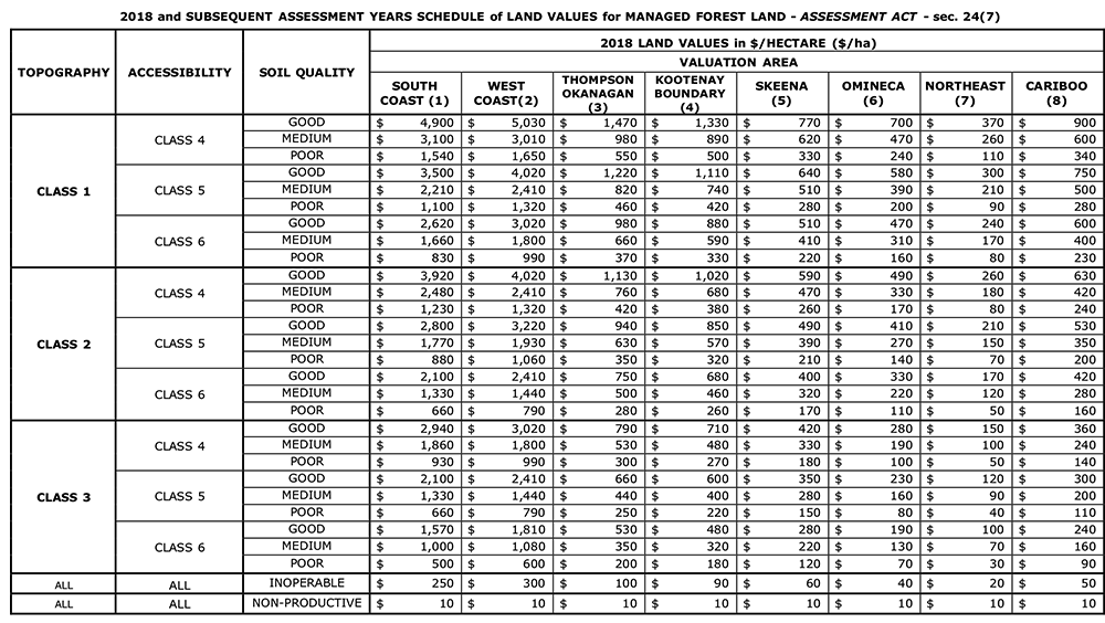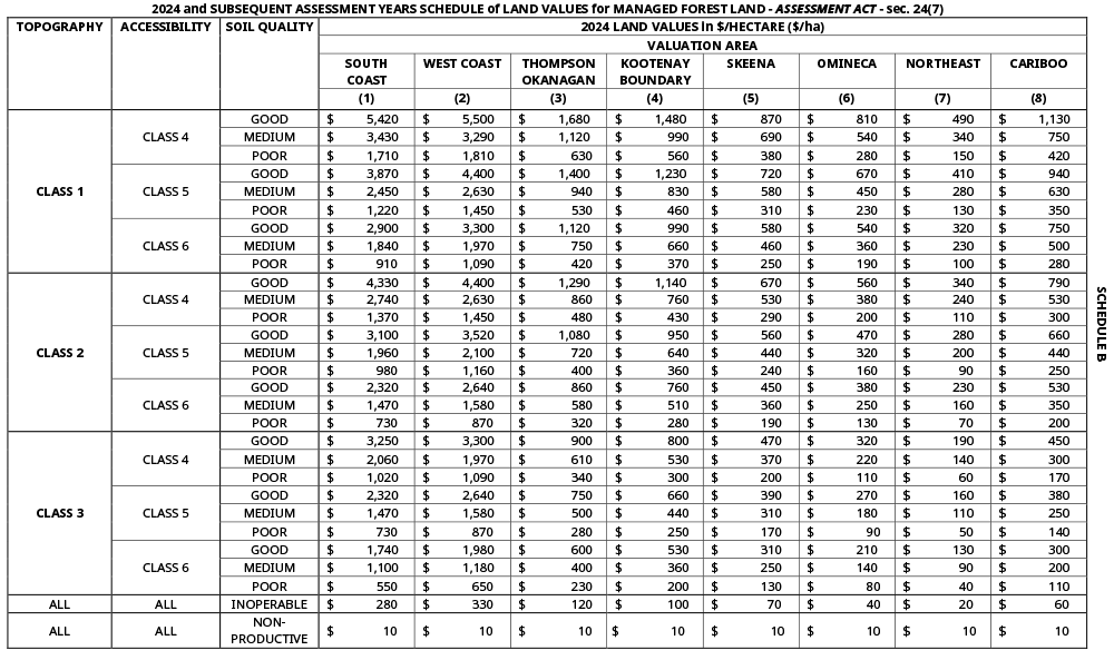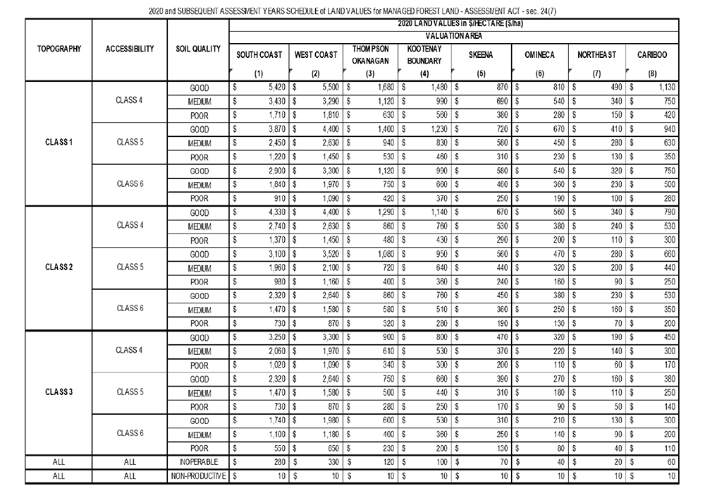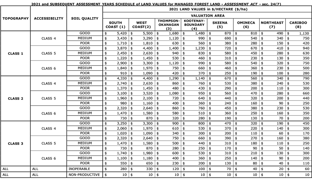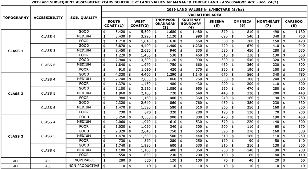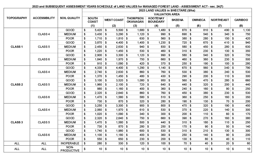 2011 and SUBSEQUENT ASSESSMENT YEARS SCHEDULE of LAND VALUES for MANAGED FOREST LAND — ASSESSMENT ACT — sec. 24 (7)