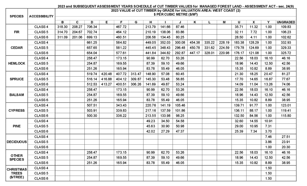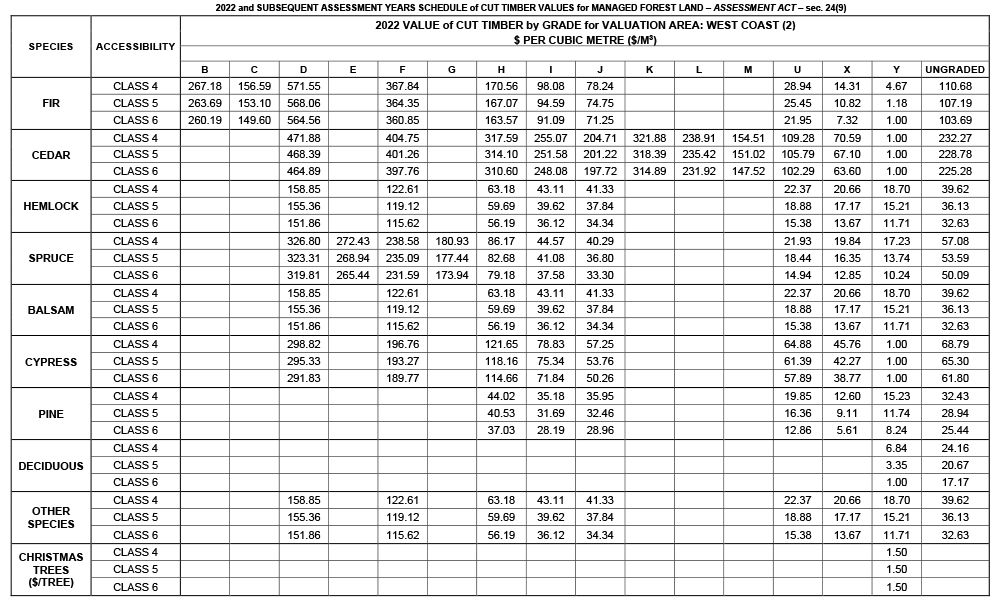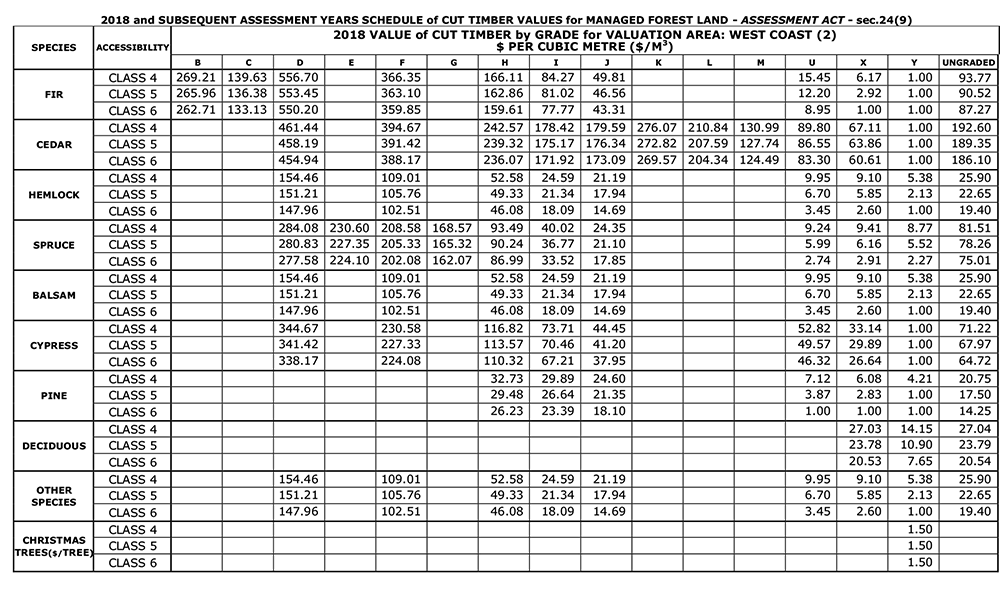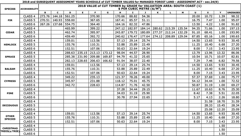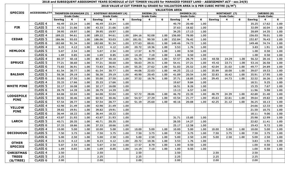 | SPECIES | ACCESSIBILITY | 2017 VALUE of CUT TIMBER by GRADE for VALUATION AREA in $ PER CUBIC METRE ($/m3) | |||||||||||||||||