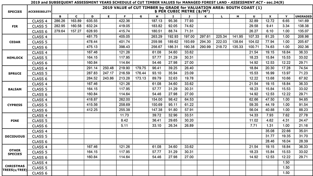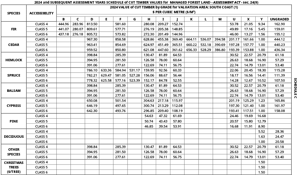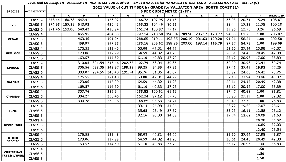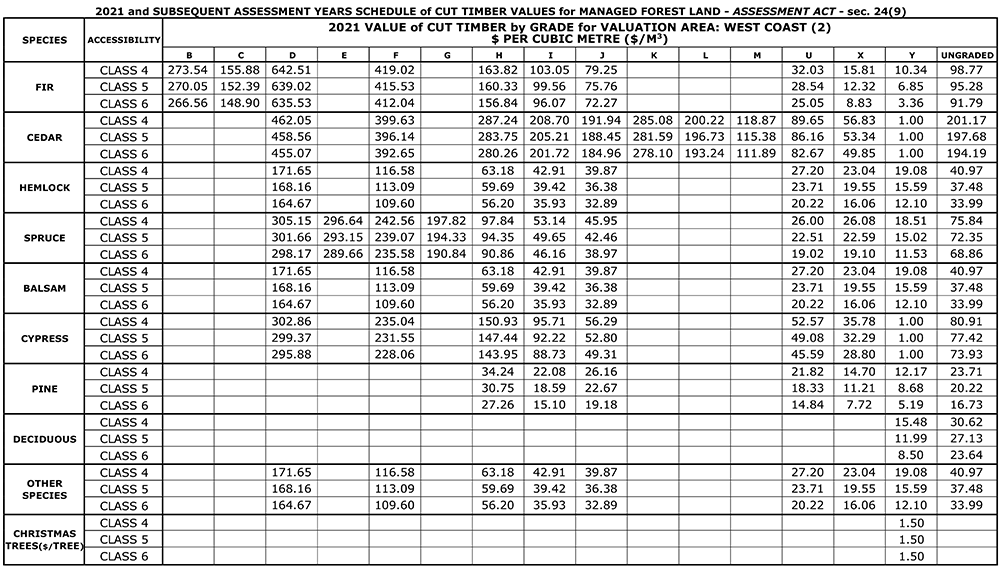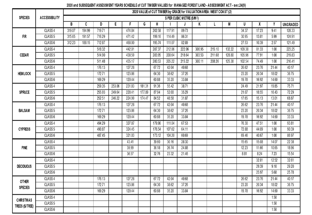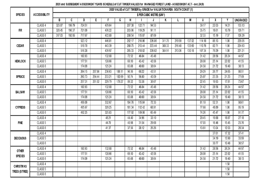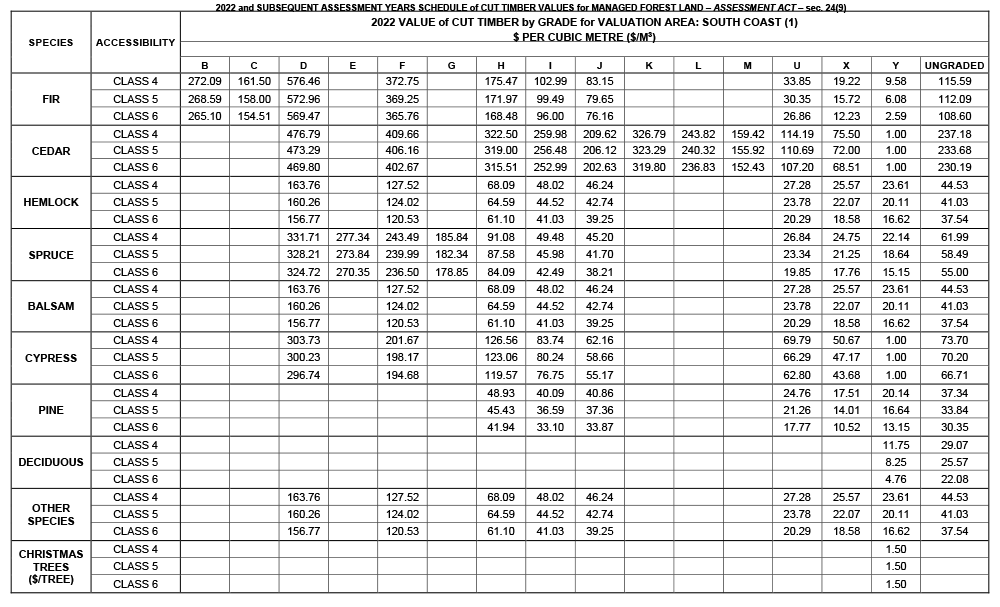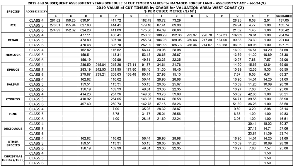| SPECIES | ACCESSIBILITY | 2016 VALUE of CUT TIMBER by GRADE for VALUATION AREA in $ PER CUBIC METRE ($/m3) | |||||||||||||||||